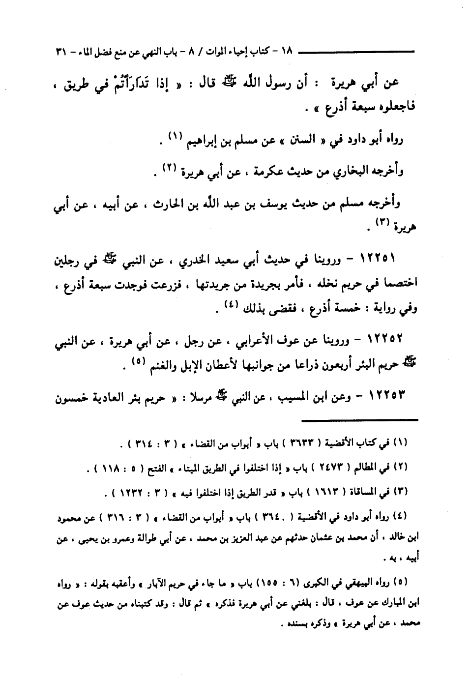 12253 - وَعَنِ ابْنِ الْمُسَيِّبِ، عَنِ النَّبِيِّ صَلَّى اللهُ عَلَيْهِ وَسَلَّمَ مُرْسَلًا: § «حَرِيمُ بِئْرِ الْعَادِيَّةِ خَمْسُونَ -[32]- ذِرَاعًا، وَحَرِيمُ بِئْرِ الْبَدِيِّ خَمْسَةٌ وَعِشْرُونَ ذِرَاعًا». قَالَ ابْنُ الْمُسَيِّبِ مِنْ قِبَلِ نَفْسِهِ: وَحَرِيمُ قَلِيبِ الزَّرْعِ ثَلَاثُمِائَةِ ذِرَاعٍ