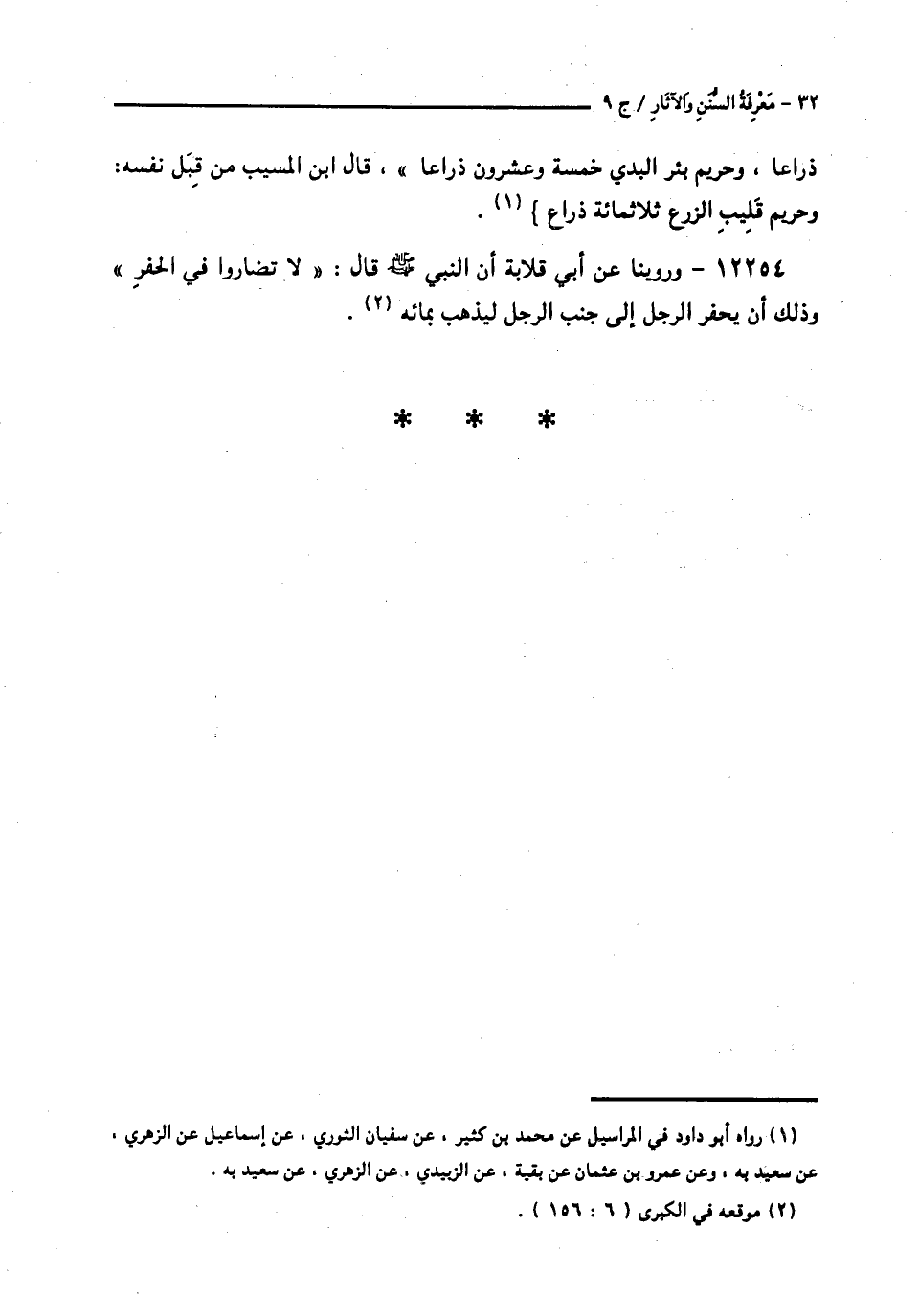 12254 - وَرُوِّينَا، عَنْ أَبِي قِلَابَةَ أَنَّ النَّبِيَّ صَلَّى اللهُ عَلَيْهِ وَسَلَّمَ قَالَ: § «لَا تُضَارُّوا فِي الْحَفْرِ». وَذَلِكَ أَنْ يَحْفِرَ الرَّجُلُ إِلَى جَنْبِ الرَّجُلِ لِيُذْهِبَ بِمَائِهِ