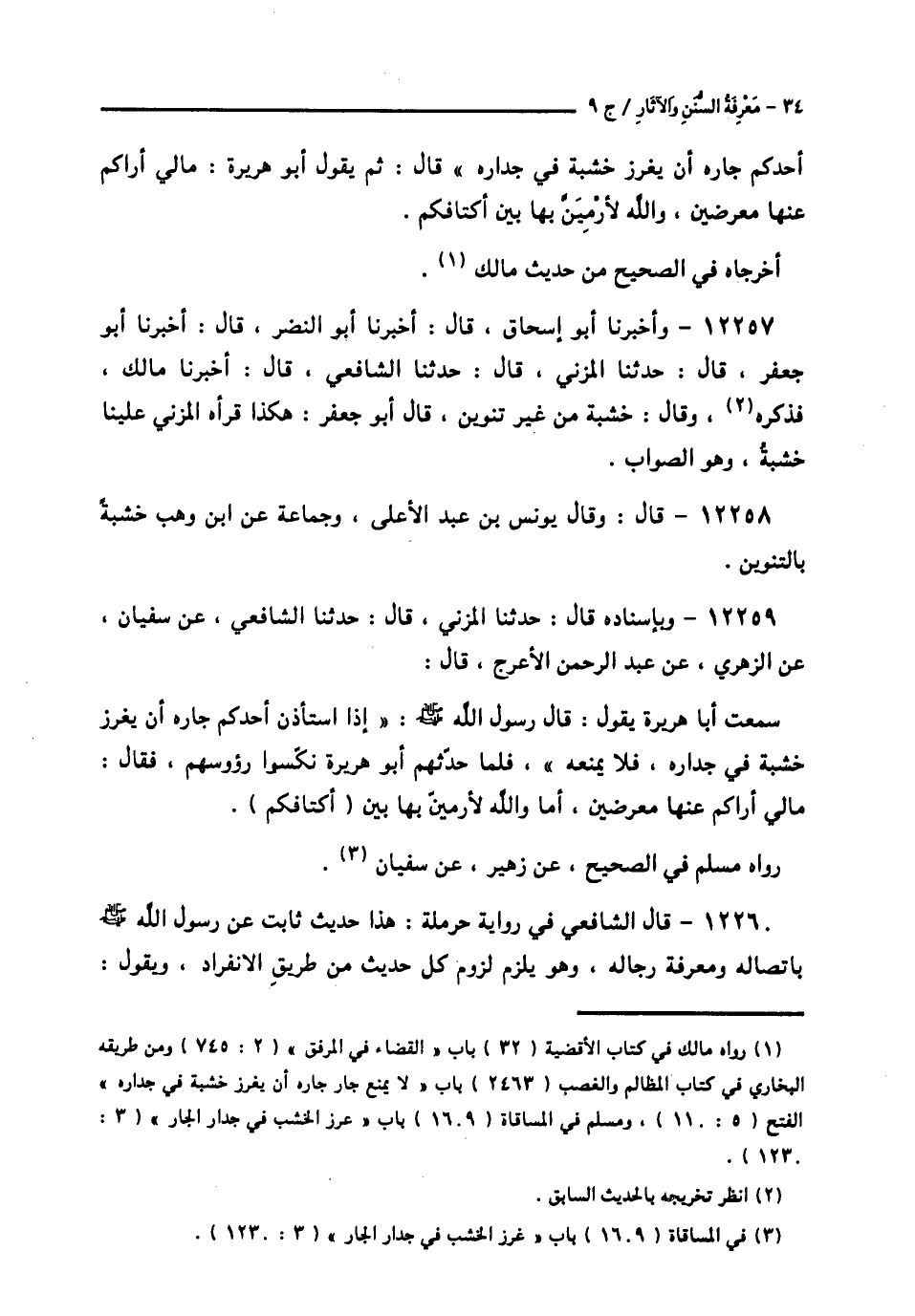 12259 - وَبِإِسْنَادِهِ قَالَ: حَدَّثَنَا الْمُزَنِيُّ قَالَ: حَدَّثَنَا الشَّافِعِيُّ، عَنْ سُفْيَانَ، عَنِ الزُّهْرِيِّ، عَنْ عَبْدِ الرَّحْمَنِ الْأَعْرَجِ قَالَ: سَمِعْتُ أَبَا هُرَيْرَةَ يَقُولُ: قَالَ رَسُولُ اللَّهِ صَلَّى اللهُ عَلَيْهِ وَسَلَّمَ: § «إِذَا اسْتَأْذَنَ أَحَدَكُمْ جَارُهُ أَنْ يَغْرِزَ خَشَبَةً فِي جِدَارِهِ فَلَا يَمْنَعْهُ». فَلَمَّا حَدَّثَهُمْ أَبُو هُرَيْرَةَ نَكَّسُوا رُءُوسَهُمْ، فَقَالَ: مَا لِي أَرَاكُمْ عَنْهَا مُعْرِضِينَ، أَمَا وَاللَّهِ لَأَرْمِيَنَّ بِهَا بَيْنَ أَكْتَافِكُمْ. رَوَاهُ مُسْلِمٌ فِي الصَّحِيحِ، عَنْ زُهَيْرٍ عَنْ سُفْيَانَ.