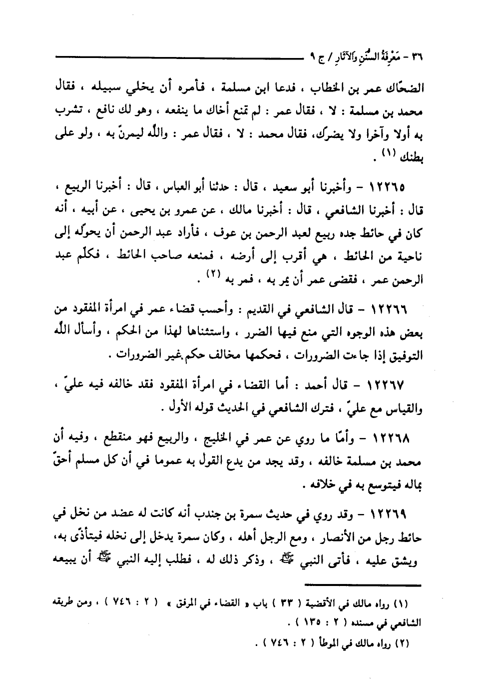 12268 - وَأَمَّا مَا رُوِيَ عَنْ عُمَرَ فِي الْخَلِيجِ، وَالرَّبِيعِ فَهُوَ مُنْقَطِعٌ، وَفِيهِ أَنَّ مُحَمَّدَ بْنَ مَسْلَمَةَ خَالَفَهُ، وَقَدْ يَجِدُ مَنْ يَدَعُ الْقَوْلَ بِهِ عُمُومًا فِي أَنَّ كُلَّ مُسْلِمٍ أَحَقُّ بِمَالِهِ فَيَتَوَسَّعُ بِهِ فِي خِلَافِهِ