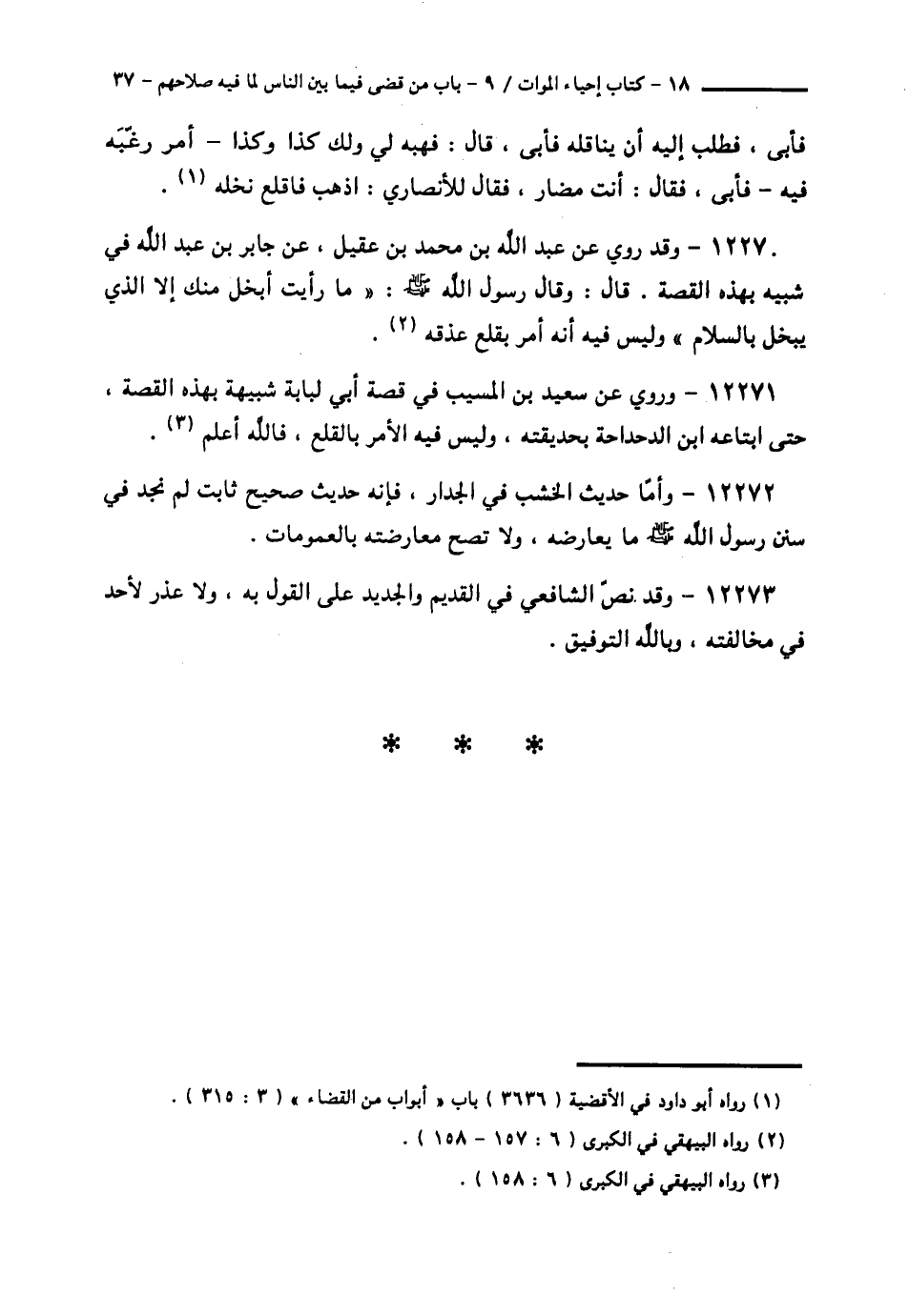 12272 - وَأَمَّا حَدِيثُ الْخَشَبِ فِي الْجِدَارِ، فَإِنَّهُ حَدِيثٌ صَحِيحٌ ثَابِتٌ لَمْ نَجِدْ فِي سُنَنِ رَسُولِ اللَّهِ صَلَّى اللهُ عَلَيْهِ وَسَلَّمَ مَا يُعَارِضُهُ، وَلَا تَصِحُّ مُعَارَضَتُهُ بِالْعُمُومَاتِ.