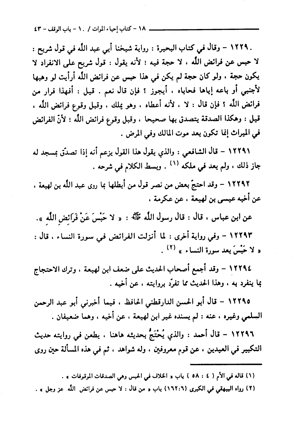 12293 - وَفِي رِوَايَةٍ أُخْرَى: لَمَّا أُنْزِلَتِ الْفَرَائِضُ فِي سُورَةِ النِّسَاءِ قَالَ: § «لَا حَبْسَ بَعْدَ سُورَةِ النِّسَاءِ».