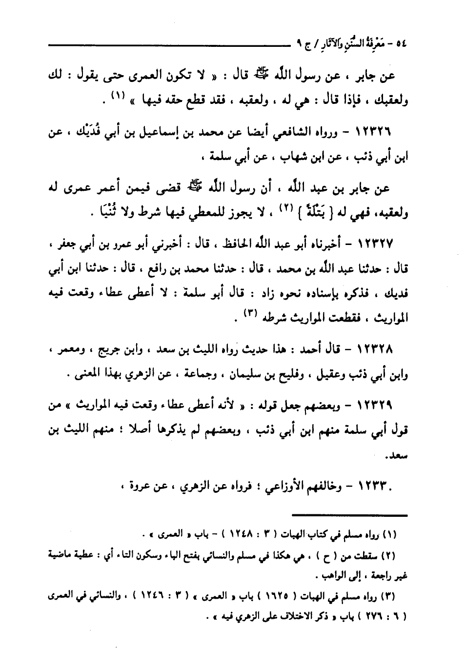 12326 - وَرَوَاهُ الشَّافِعِيُّ أَيْضًا عَنْ مُحَمَّدِ بْنِ إِسْمَاعِيلَ بْنِ أَبِي فُدَيْكٍ، عَنِ ابْنِ أَبِي ذِئْبٍ، عَنِ ابْنِ شِهَابٍ، عَنْ أَبِي سَلَمَةَ، عَنْ جَابِرِ بْنِ عَبْدِ اللَّهِ، أَنَّ رَسُولَ اللَّهِ صَلَّى اللهُ عَلَيْهِ وَسَلَّمَ §قَضَى فِيمَنْ أُعْمِرَ عُمْرَى لَهُ وَلِعَقِبِهِ، فَهِيَ لَهُ بَتْلَةً، لَا يَجُوزُ لِلْمُعْطِي فِيهَا شَرْطٌ وَلَا ثُنْيَا ".