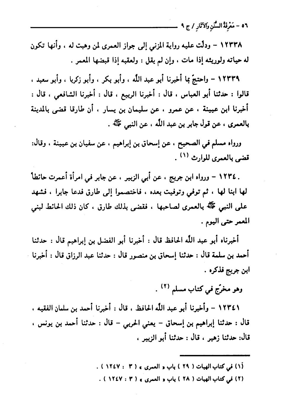 12340 - وَرَوَاهُ ابْنُ جُرَيْجٍ، عَنْ أَبِي الزُّبَيْرِ، عَنْ جَابِرٍ: «فِي امْرَأَةٍ أَعْمَرَتْ حَائِطًا لَهَا ابْنًا لَهَا، ثُمَّ تُوُفِّيَ وَتُوُفِّيَتْ بَعْدَهُ، فَاخْتَصَمُوا إِلَى طَارِقٍ فَدَعَا جَابِرًا، §فَشَهِدَ عَلَى النَّبِيِّ صَلَّى اللهُ عَلَيْهِ وَسَلَّمَ بِالْعُمْرَى لِصَاحِبِهَا»، فَقَضَى بِذَلِكَ طَارِقٌ، كَانَ ذَلِكَ الْحَائِطُ لِبَنِي الْمُعْمَرِ حَتَّى الْيَوْمِ. أَخْبَرَنَاهُ أَبُو عَبْدِ اللَّهِ الْحَافِظُ قَالَ: أَخْبَرَنَا أَبُو الْفَضْلِ بْنُ إِبْرَاهِيمَ قَالَ: حَدَّثَنَا أَحْمَدُ بْنُ سَلَمَةَ قَالَ: حَدَّثَنَا إِسْحَاقُ بْنُ مَنْصُورٍ قَالَ: حَدَّثَنَا عَبْدُ الرَّزَّاقِ قَالَ: أَخْبَرَنَا ابْنُ جُرَيْجٍ فَذَكَرَهُ. وَهُوَ مُخَرَّجٌ فِي كِتَابِ مُسْلِمٍ