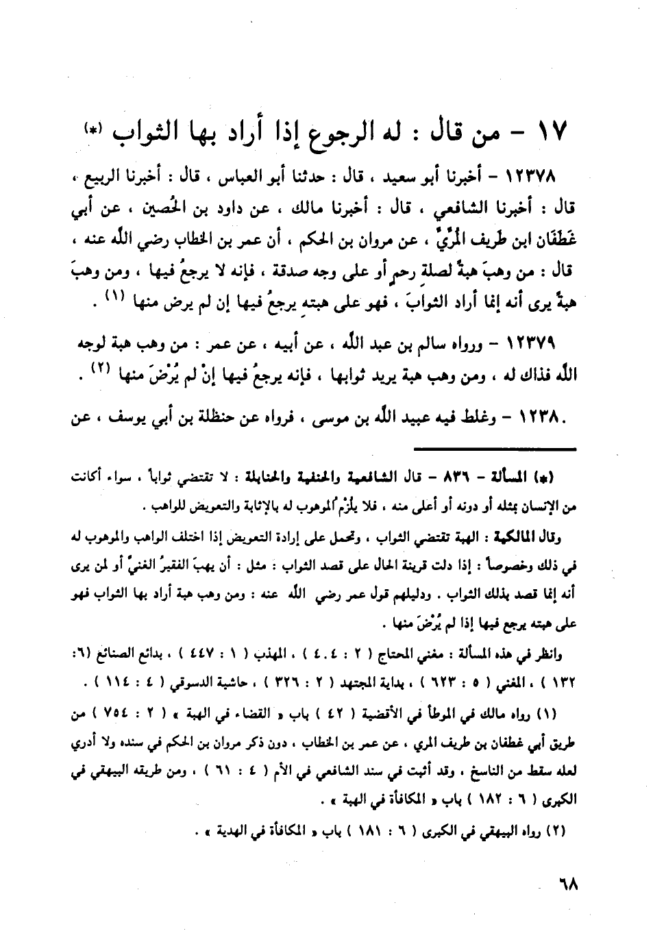 12378 - أَخْبَرَنَا أَبُو سَعِيدٍ قَالَ: حَدَّثَنَا أَبُو الْعَبَّاسِ قَالَ: أَخْبَرَنَا الرَّبِيعُ قَالَ: أَخْبَرَنَا الشَّافِعِيُّ قَالَ: أَخْبَرَنَا مَالِكٌ، عَنْ دَاوُدَ بْنِ الْحُصَيْنِ، عَنْ أَبِي غَطَفَانَ بْنِ طَرِيفٍ الْمُرِّيِّ، عَنْ مَرْوَانَ بْنِ الْحَكَمِ، أَنَّ عُمَرَ بْنَ الْخَطَّابِ رَضِيَ اللَّهُ عَنْهُ قَالَ: «§مَنْ وَهَبَ هِبَةً لِصِلَةِ رَحِمٍ أَوْ عَلَى وَجْهِ صَدَقَةٍ، فَإِنَّهُ لَا يَرْجِعُ فِيهَا، وَمَنْ وَهَبَ هِبَةً يَرَى أَنَّهُ إِنَّمَا أَرَادَ الثَّوَابَ، فَهُوَ عَلَى هِبَتِهِ يَرْجِعُ فِيهَا إِنْ لَمْ يُرْضَ مِنْهَا»