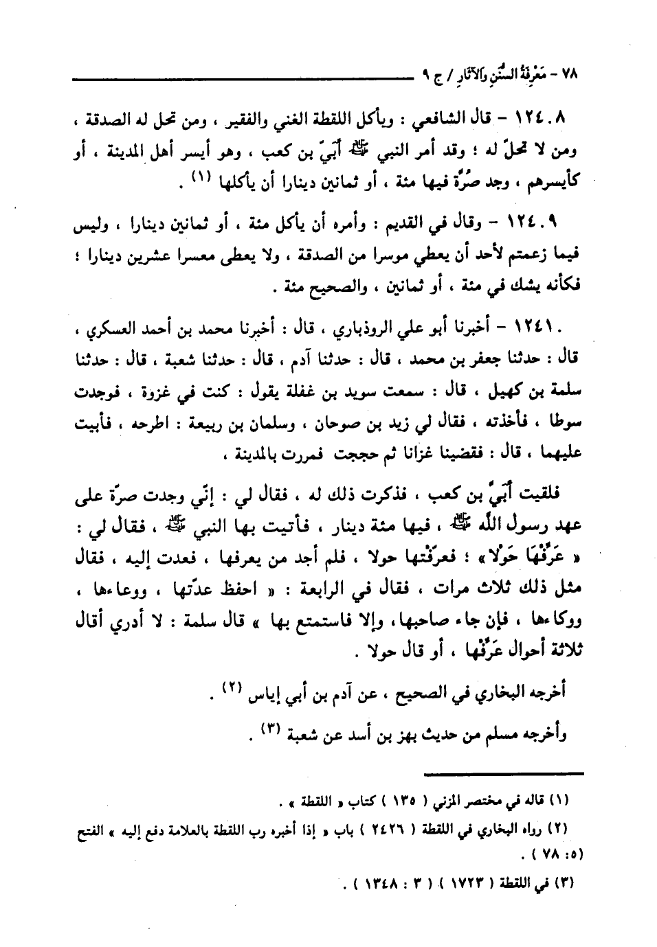 12410 - أَخْبَرَنَا أَبُو عَلِيٍّ الرُّوذْبَارِيُّ قَالَ: أَخْبَرَنَا مُحَمَّدُ بْنُ أَحْمَدَ الْعَسْكَرِيُّ قَالَ: حَدَّثَنَا جَعْفَرُ بْنُ مُحَمَّدٍ قَالَ: حَدَّثَنَا آدَمُ قَالَ: حَدَّثَنَا شُعْبَةُ قَالَ: حَدَّثَنَا سَلَمَةُ بْنُ كُهَيْلِ قَالَ: سَمِعْتُ سُوَيْدَ بْنَ غَفَلَةَ، يَقُولُ: كُنْتُ فِي غَزْوَةٍ، فَوَجَدْتُ سَوْطًا، فَأَخَذْتُهُ، فَقَالَ لِي زَيْدُ بْنُ صُوحَانَ، وَسَلْمَانُ بْنُ رَبِيعَةَ: اطْرَحْهُ، فَأَبَيْتُ عَلَيْهِمَا قَالَ: فَقَضَيْنَا غَزَاتَنَا ثُمَّ حَجَجْتُ فَمَرَرْتُ بِالْمَدِينَةِ، فَلَقِيتُ أُبَيَّ بْنَ كَعْبٍ، فَذَكَرْتُ ذَلِكَ لَهُ، فَقَالَ لِي: إِنِّي وَجَدْتُ صُرَّةً عَلَى عَهْدِ رَسُولِ اللَّهِ صَلَّى اللهُ عَلَيْهِ وَسَلَّمَ، فِيهَا مِائَةُ دِينَارٍ، فَأَتَيْتُ بِهَا النَّبِيَّ صَلَّى اللهُ عَلَيْهِ وَسَلَّمَ، فَقَالَ لِي: «§عَرِّفْهَا حَوْلًا». فَعَرَّفْتُهَا حَوْلًا، فَلَمْ أَجِدْ مَنْ يَعْرِفُهَا، فَعُدْتُ إِلَيْهِ، فَقَالَ مِثْلَ ذَلِكَ ثَلَاثَ مَرَّاتٍ، فَقَالَ فِي الرَّابِعَةِ: «احْفَظْ عِدَّتَهَا، وَوِعَاءَهَا، وَوِكَاءَهَا، فَإِنْ جَاءَ صَاحِبُهَا، وَإِلَّا فَاسْتَمْتِعْ بِهَا». قَالَ سَلَمَةُ: لَا أَدْرِي أَقَالَ: ثَلَاثَةَ أَحْوَالٍ عَرِّفْهَا، أَوْ قَالَ: حَوْلًا. أَخْرَجَهُ الْبُخَارِيُّ فِي الصَّحِيحِ، عَنْ آدَمَ بْنِ أَبِي إِيَاسٍ. وَأَخْرَجَهُ مُسْلِمٌ مِنْ حَدِيثِ بَهْزِ بْنِ أَسَدٍ عَنْ شُعْبَةَ -[79]-
