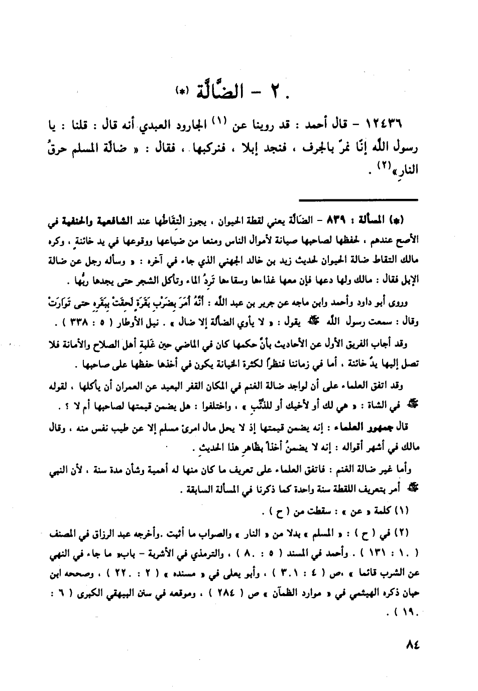 12436 - قَالَ أَحْمَدُ: قَدْ رُوِّينَا، عَنِ الْجَارُودِ الْعَبْدِيِّ، أَنَّهُ قَالَ: قُلْنَا: يَا رَسُولَ اللَّهِ، إِنَّا نَمُرُّ بِالْجُرُفِ فَنَجِدُ إِبِلًا، فَنَرْكَبُهَا، فَقَالَ: § «ضَالَّةُ الْمُسْلِمِ حَرْقُ النَّارِ» -[85]-.
