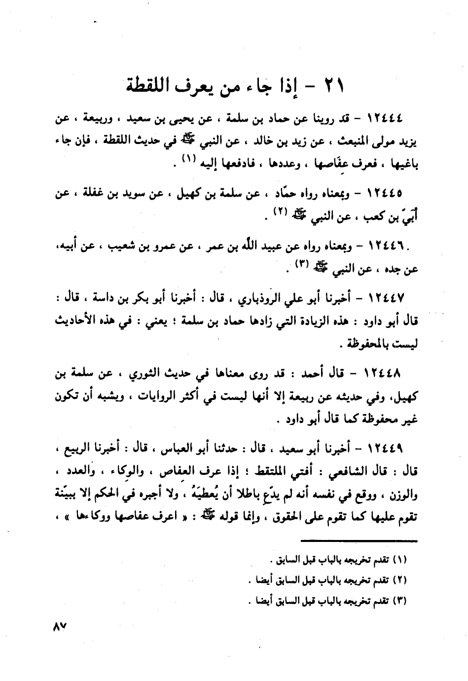 12444 - قَدْ رُوِّينَا عَنْ حَمَّادِ بْنِ سَلَمَةَ، عَنْ يَحْيَى بْنِ سَعِيدٍ، وَرَبِيعَةَ، عَنْ يَزِيدَ مَوْلَى الْمُنْبَعِثِ، عَنْ زَيْدِ بْنِ خَالِدٍ، عَنِ النَّبِيِّ صَلَّى اللهُ عَلَيْهِ وَسَلَّمَ فِي حَدِيثِ اللُّقَطَةِ: «§فَإِنْ جَاءَ بَاغِيهَا، فَعَرَفَ عِفَاصَهَا، وَعَدَدَهَا، فَادْفَعْهَا إِلَيْهِ».