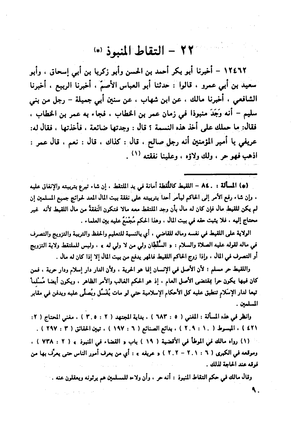 12462 - أَخْبَرَنَا أَبُو بَكْرٍ أَحْمَدُ بْنُ الْحَسَنِ، وَأَبُو زَكَرِيَّا بْنُ أَبِي إِسْحَاقَ، وَأَبُو سَعِيدِ بْنُ أَبِي عَمْرٍو، قَالُوا: حَدَّثَنَا أَبُو الْعَبَّاسِ الْأَصَمُّ، أَخْبَرَنَا الرَّبِيعُ، أَخْبَرَنَا الشَّافِعِيُّ، أَخْبَرَنَا مَالِكٌ، عَنِ ابْنِ شِهَابٍ، عَنْ سُنَيْنٍ أَبِي جَمِيلَةَ، رَجُلٌ مِنْ بَنِي سُلَيْمٍ، أَنَّهُ وَجَدَ مَنْبُوذًا فِي زَمَانِ عُمَرَ بْنِ الْخَطَّابِ، فَجَاءَ بِهِ عُمَرَ بْنَ الْخَطَّابِ، فَقَالَ: «مَا حَمَلَكَ عَلَى أَخْذِ هَذِهِ النَّسَمَةِ؟» قَالَ: وَجَدْتُهَا ضَائِعَةً، فَأَخَذْتُهَا، فَقَالَ لَهُ عَرِيفِيٌّ: يَا أَمِيرَ الْمُؤْمِنِينَ، إِنَّهُ رَجُلٌ صَالِحٌ قَالَ: «كَذَاكَ؟» قَالَ: نَعَمْ قَالَ عُمَرُ: «§اذْهَبْ فَهُوَ حُرٌّ، وَلَكَ وَلَاؤُهُ، وَعَلَيْنَا نَفَقَتُهُ» -[91]-.