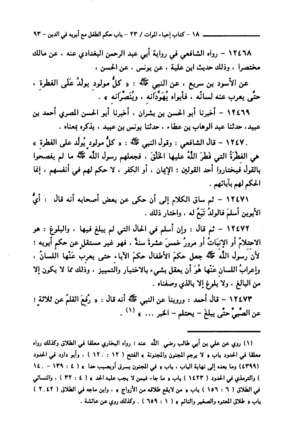 12473 - قَالَ أَحْمَدُ: وَرُوِّينَا، عَنِ النَّبِيِّ صَلَّى اللهُ عَلَيْهِ وَسَلَّمَ أَنَّهُ قَالَ: " §رُفِعَ الْقَلَمُ عَنْ ثَلَاثَةٍ: عَنِ الصَّبِيِّ حَتَّى يَبْلُغَ - يَحْتَلِمَ - «. . .» الْخَبَرَ -[94]-.