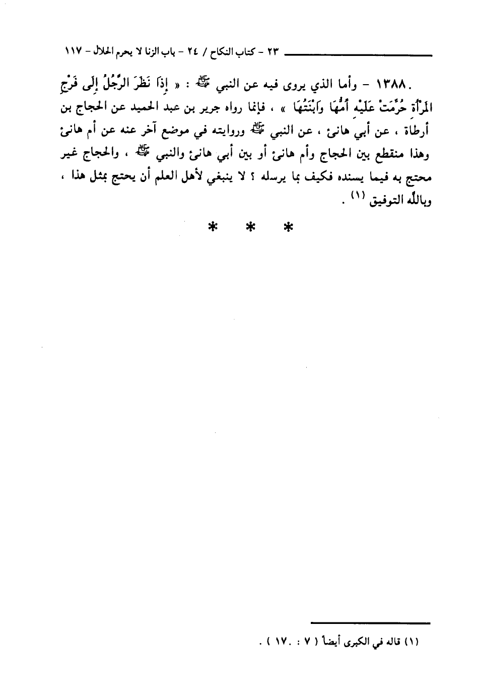 13880 - وَأَمَّا الَّذِي يُرْوَى فِيهِ عَنِ النَّبِيِّ صَلَّى اللهُ عَلَيْهِ وَسَلَّمَ: § «إِذَا نَظَرَ الرَّجُلُ إِلَى فَرْجِ الْمَرْأَةِ حُرِّمَتْ عَلَيْهِ أُمُّهَا وَابْنَتُهَا» فَإِنَّمَا رَوَاهُ جَرِيرُ بْنُ عَبْدِ الْحَمِيدِ، عَنِ الْحَجَّاجِ بْنِ أَرْطَاةَ، عَنْ أَبِي هَانِئٍ، عَنِ النَّبِيِّ صَلَّى اللهُ عَلَيْهِ وَسَلَّمَ، وَرِوَايَتُهُ فِي مَوْضِعٍ آخَرَ عَنْهُ عَنْ أُمِّ هَانِئٍ، وَهَذَا مُنْقَطِعٌ بَيْنَ الْحَجَّاجِ، وَأُمِّ هَانِئٍ، أَوْ بَيْنَ أَبِي هَانِئٍ وَالنَّبِيِّ صَلَّى اللهُ عَلَيْهِ وَسَلَّمَ، وَالْحَجَّاجُ غَيْرُ مُحْتَجٍّ بِهِ فِيمَا يُسْنِدْهُ فَكَيْفَ بِمَا يُرْسِلُهُ؟ لَا يَنْبَغِي لِأَهْلِ الْعِلْمِ أَنْ يُحْتَجَّ بِمِثْلِ هَذَا، وَبِاللَّهِ التَّوْفِيقُ