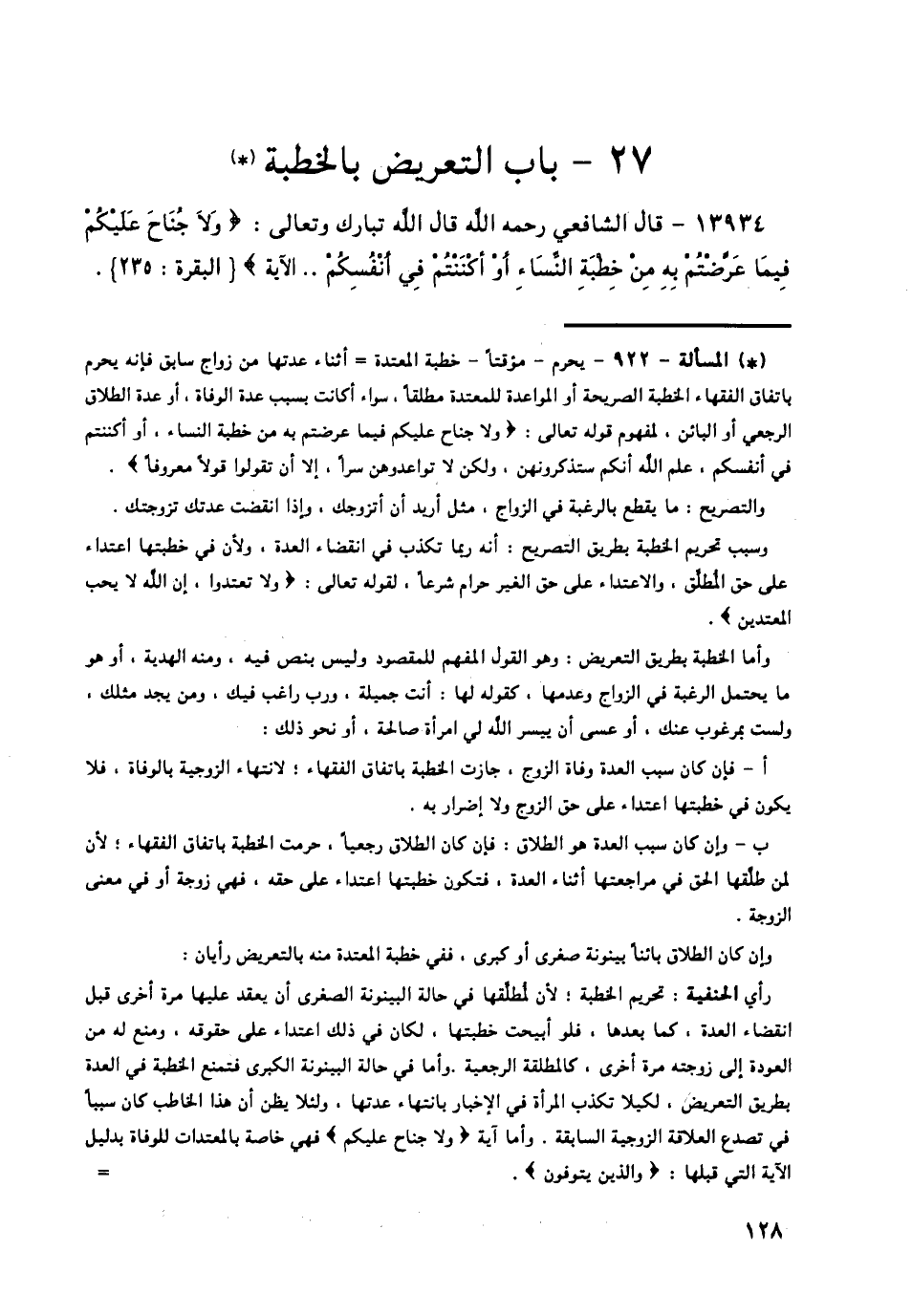 13934 - قَالَ الشَّافِعِيُّ رَحِمَهُ اللَّهُ: قَالَ اللَّهُ تَبَارَكَ وَتَعَالَى: {وَلَا جُنَاحَ عَلَيْكُمْ فِيمَا عَرَّضْتُمْ بِهِ مِنْ خِطْبَةِ النِّسَاءِ أَوْ أَكْنَنْتُمْ فِي أَنْفُسِكُمْ} [البقرة: 235] الْآيَةَ
