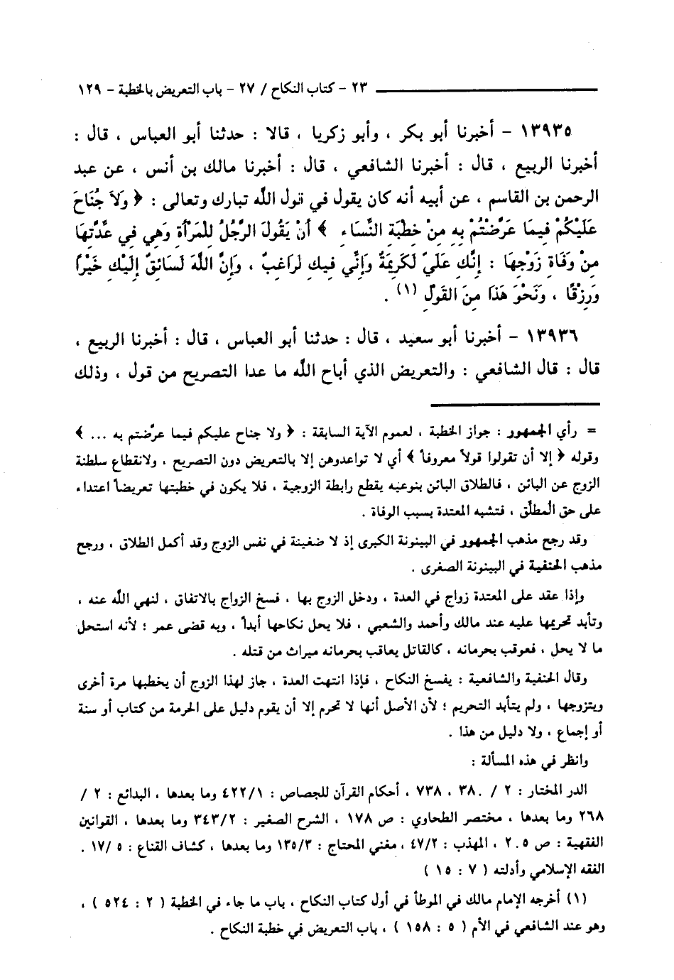 13935 - أَخْبَرَنَا أَبُو بَكْرٍ، وَأَبُو زَكَرِيَّا قَالَا: حَدَّثَنَا أَبُو الْعَبَّاسِ قَالَ: أَخْبَرَنَا الرَّبِيعُ قَالَ: أَخْبَرَنَا الشَّافِعِيُّ قَالَ: أَخْبَرَنَا مَالِكُ بْنُ أَنَسٍ، عَنْ عَبْدِ الرَّحْمَنِ بْنِ الْقَاسِمِ، عَنْ أَبِيهِ، أَنَّهُ: كَانَ يَقُولُ فِي قَوْلِ اللَّهِ تَبَارَكَ وَتَعَالَى: {وَلَا جُنَاحَ عَلَيْكُمْ فِيمَا عَرَّضْتُمْ بِهِ مِنْ خِطْبَةِ النِّسَاءِ} [البقرة: 235] أَنْ «§يَقُولَ الرَّجُلُ لِلْمَرْأَةِ وَهِيَ فِي عِدَّتِهَا مِنْ وَفَاةِ زَوْجِهَا، إِنَّكِ عَلَيَّ لَكَرِيمَةٌ وَإِنِّي فِيكِ لَرَاغِبٌ، وَإِنَّ اللَّهَ لَسَائِقٌ إِلَيْكِ خَيْرًا وَرِزْقًا، وَنَحْوَ هَذَا مِنَ الْقَوْلِ»