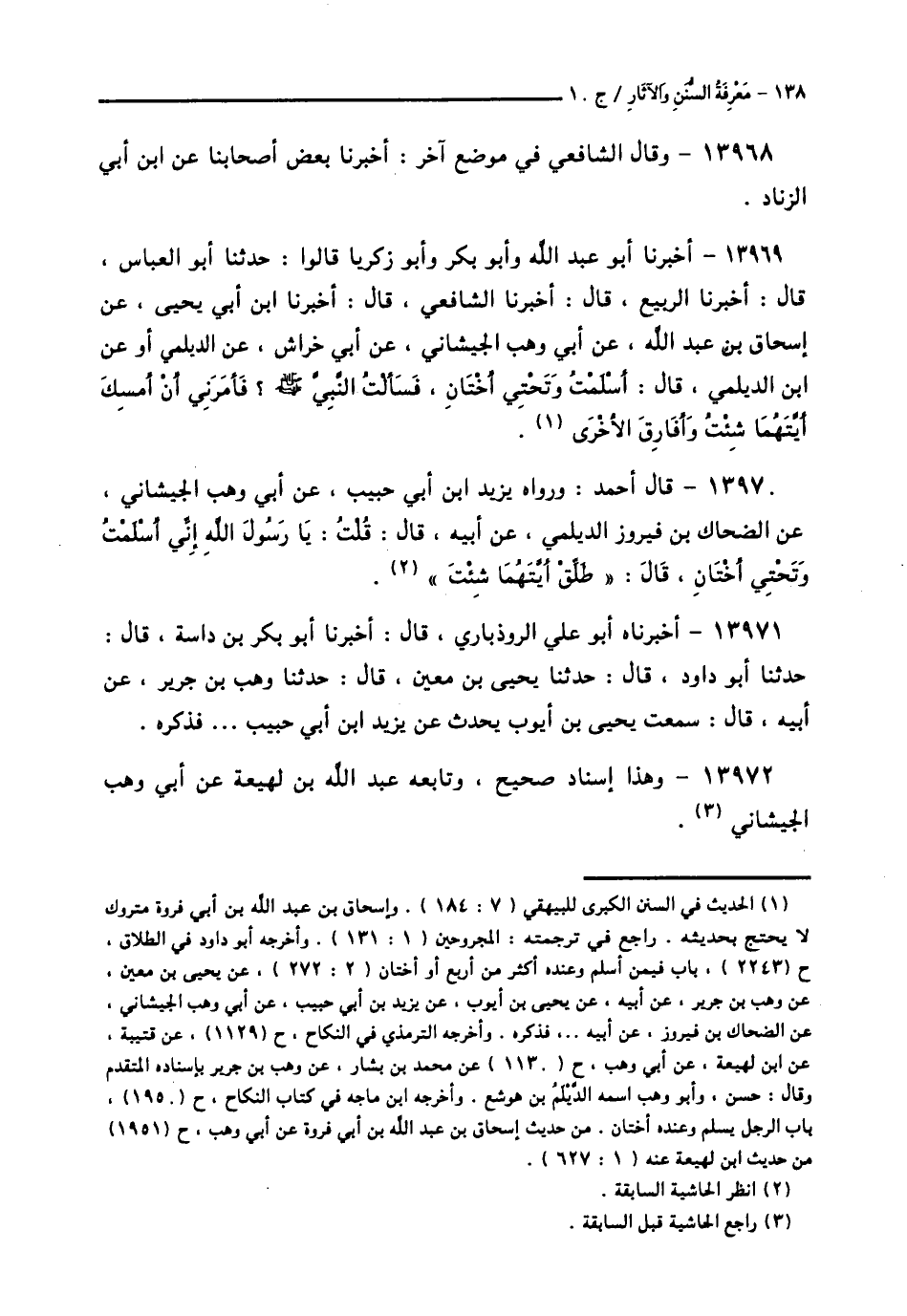 13969 - أَخْبَرَنَا أَبُو عَبْدِ اللَّهِ، وَأَبُو بَكْرٍ، وَأَبُو زَكَرِيَّا، قَالُوا: حَدَّثَنَا أَبُو الْعَبَّاسِ قَالَ: أَخْبَرَنَا الرَّبِيعُ قَالَ: أَخْبَرَنَا الشَّافِعِيُّ قَالَ: أَخْبَرَنَا ابْنُ أَبِي يَحْيَى، عَنْ إِسْحَاقَ بْنِ عَبْدِ اللَّهِ، عَنْ أَبِي وَهْبٍ الْجَيْشَانِيِّ، عَنْ أَبِي خِرَاشٍ، عَنِ الدَّيْلَمِيِّ، أَوْ عَنِ ابْنِ الدَّيْلَمِيِّ قَالَ: أَسْلَمْتُ وَتَحْتِي أُخْتَانِ، فَسَأَلْتُ النَّبِيَّ صَلَّى اللهُ عَلَيْهِ وَسَلَّمَ؟ § «فَأَمَرَنِي أَنْ أُمْسِكَ أَيَّتَهُمَا شِئْتُ وَأُفَارِقُ الْأُخْرَى»