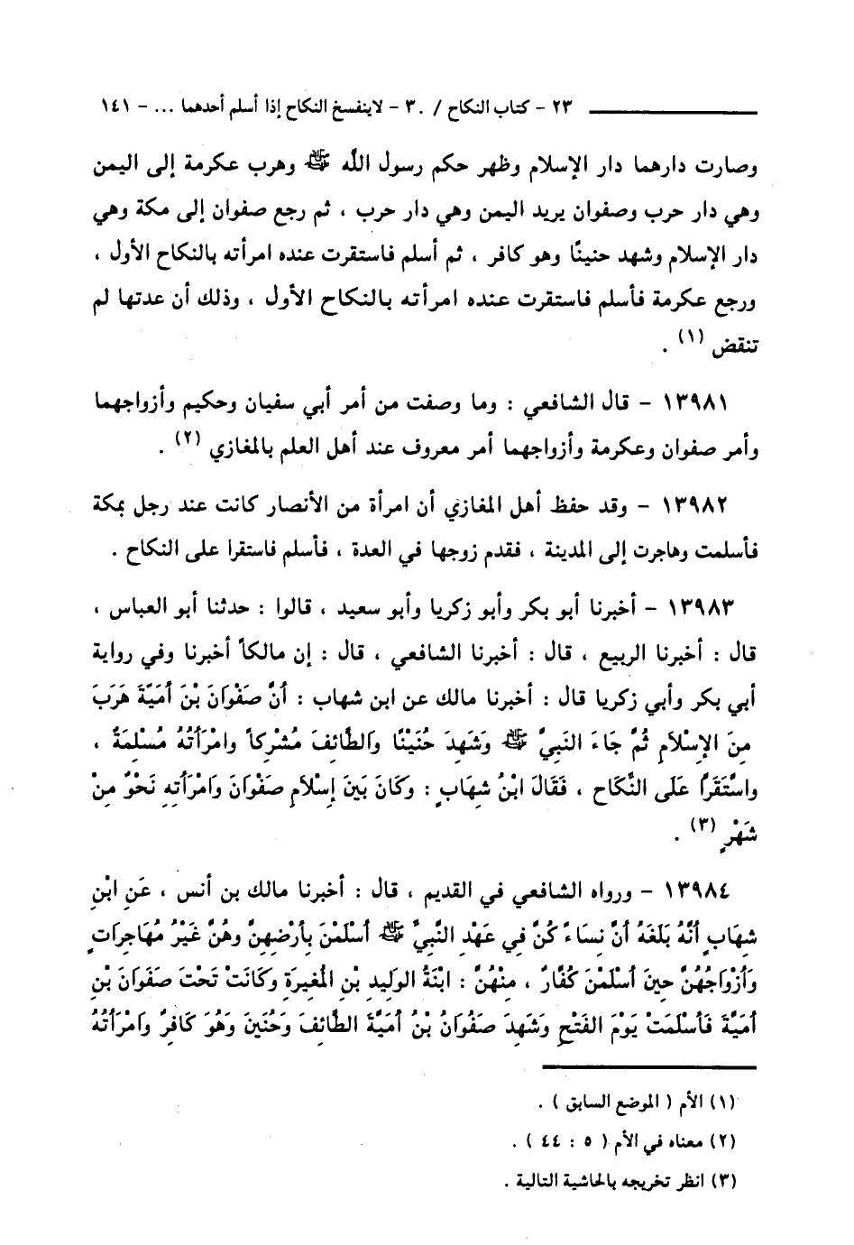 13983 - أَخْبَرَنَا أَبُو بَكْرٍ، وَأَبُو زَكَرِيَّا، وَأَبُو سَعِيدٍ، قَالُوا: حَدَّثَنَا أَبُو الْعَبَّاسِ قَالَ: أَخْبَرَنَا الرَّبِيعُ قَالَ: أَخْبَرَنَا الشَّافِعِيُّ قَالَ: إِنَّ مَالِكًا أَخْبَرَنَا وَفِي رِوَايَةِ أَبِي بَكْرٍ وَأَبِي زَكَرِيَّا قَالَ: أَخْبَرَنَا مَالِكٌ، عَنِ ابْنِ شِهَابٍ أَنَّ «صَفْوَانَ بْنَ أُمَيَّةَ §هَرَبَ مِنَ الْإِسْلَامِ ثُمَّ جَاءَ النَّبِيَّ صَلَّى اللهُ عَلَيْهِ وَسَلَّمَ وَشَهِدَ حُنَيْنًا وَالطَّائِفَ مُشْرِكًا وَامْرَأَتُهُ مَسْلِمَةٌ، وَاسْتَقَرَّا عَلَى النِّكَاحِ» فَقَالَ ابْنُ شِهَابٍ: وَكَانَ بَيْنَ إِسْلَامِ صَفْوَانَ وَامْرَأَتِهِ نَحْوٌ مِنْ شَهْرٍ