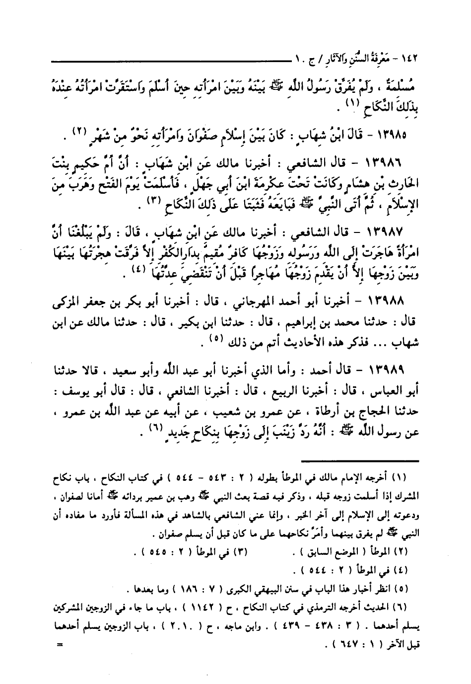 13986 - قَالَ الشَّافِعِيُّ: أَخْبَرَنَا مَالِكٌ، عَنِ ابْنِ شِهَابٍ أَنَّ «أُمَّ حَكِيمٍ بِنْتَ الْحَارِثِ بْنِ هِشَامٍ وَكَانَتْ تَحْتَ عِكْرِمَةَ بْنِ أَبِي جَهْلٍ، §فَأَسْلَمَتْ يَوْمَ الْفَتْحِ وَهَرَبَ مِنَ الْإِسْلَامِ، ثُمَّ أَتَى النَّبِيَّ صَلَّى اللهُ عَلَيْهِ وَسَلَّمَ فَبَايَعَهُ فَثَبَتَا عَلَى ذَلِكَ النِّكَاحِ»