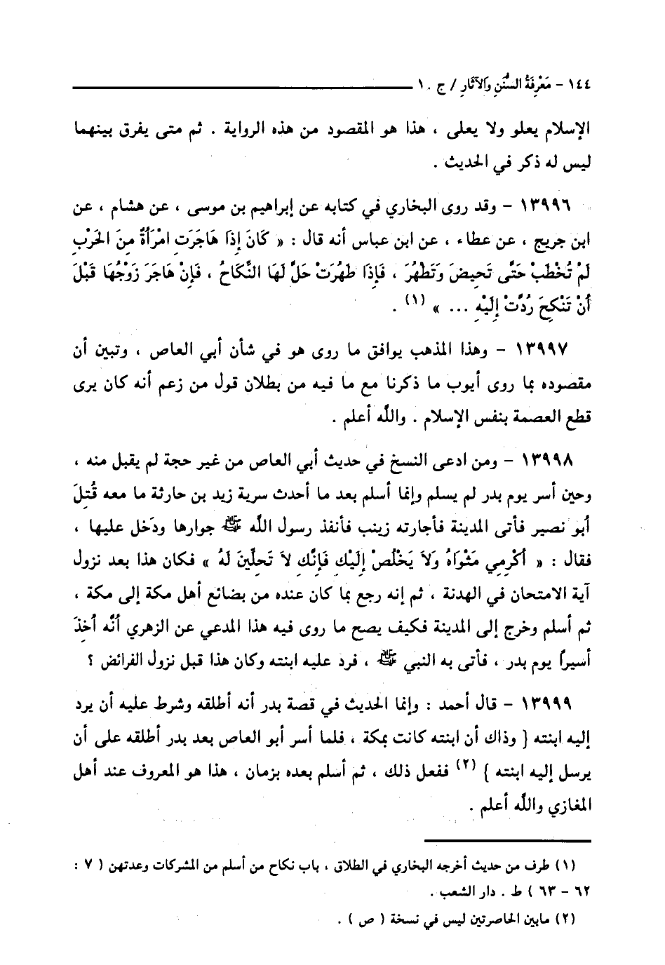 13998 - وَمَنِ ادَّعَى النَّسْخَ فِي حَدِيثِ أَبِي الْعَاصِ مِنْ غَيْرِ حُجَّةٍ لَمْ يُقْبَلْ مِنْهُ، وَحِينَ أُسِرَ يَوْمَ بَدْرٍ لَمْ يُسْلِمْ وَإِنَّمَا أَسْلَمَ بَعْدَمَا أَحْدَثَ سَرِيَّةَ زَيْدِ بْنِ حَارِثَةَ مَا مَعَهُ قُتِلَ أَبُو نُصَيْرٍ فَأَتَى الْمَدِينَةَ فَأَجَارَتْهُ زَيْنَبُ فَأَنْفَذْ رَسُولُ اللَّهِ صَلَّى اللهُ عَلَيْهِ وَسَلَّمَ جِوَارَهَا وَدَخَلَ عَلَيْهَا، فَقَالَ: «أَكْرِمِي مَثْوَاهُ وَلَا يَخْلُصْ إِلَيْكِ فَإِنَّكِ لَا تَحِلِّينَ لَهُ»، فَكَانَ هَذَا بَعْدَ نُزُولِ آيَةِ الِامْتِحَانِ فِي الْهُدْنَةِ، ثُمَّ إِنَّهُ رَجَعَ بِمَا كَانَ عِنْدَهُ مِنْ بَضَائِعِ أَهْلِ مَكَّةَ إِلَى مَكَّةَ، ثُمَّ أَسْلَمَ وَخَرَجَ إِلَى الْمَدِينَةِ، فَكَيْفَ يَصِحُّ مَا رَوَى فِيهِ هَذَا الْمُدَّعِي عَنِ الزُّهْرِيِّ أَنَّهُ أُخِذَ أَسِيرًا يَوْمَ بَدْرٍ، فَأَتَى النَّبِيَّ صَلَّى اللهُ عَلَيْهِ وَسَلَّمَ، فَرَدَّ عَلَيْهِ ابْنَتَهُ وَكَانَ هَذَا قَبْلَ نُزُولِ الْفَرَائِضِ؟
