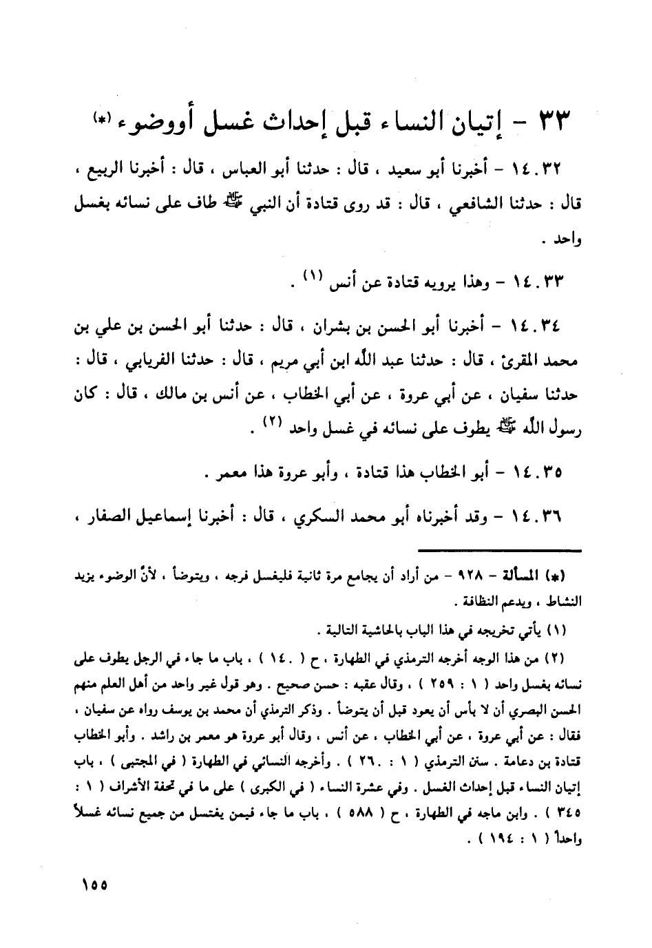 14034 - أَخْبَرَنَا أَبُو الْحُسَيْنِ بْنُ بِشْرَانَ قَالَ: حَدَّثَنَا أَبُو الْحَسَنِ بْنُ عَلِيِّ بْنِ مُحَمَّدٍ الْمُقْرِئُ قَالَ: حَدَّثَنَا عَبْدُ اللَّهِ بْنُ أَبِي مَرْيَمَ قَالَ: حَدَّثَنَا الْفِرْيَابِيُّ قَالَ: حَدَّثَنَا سُفْيَانُ، عَنْ أَبِي عُرْوَةَ، عَنْ أَبِي الْخَطَّابِ، عَنْ أَنَسِ بْنِ مَالِكٍ قَالَ: «كَانَ رَسُولُ اللَّهِ صَلَّى اللهُ عَلَيْهِ وَسَلَّمَ §يَطُوفُ عَلَى نِسَائِهِ فِي غُسْلٍ وَاحِدٍ»،