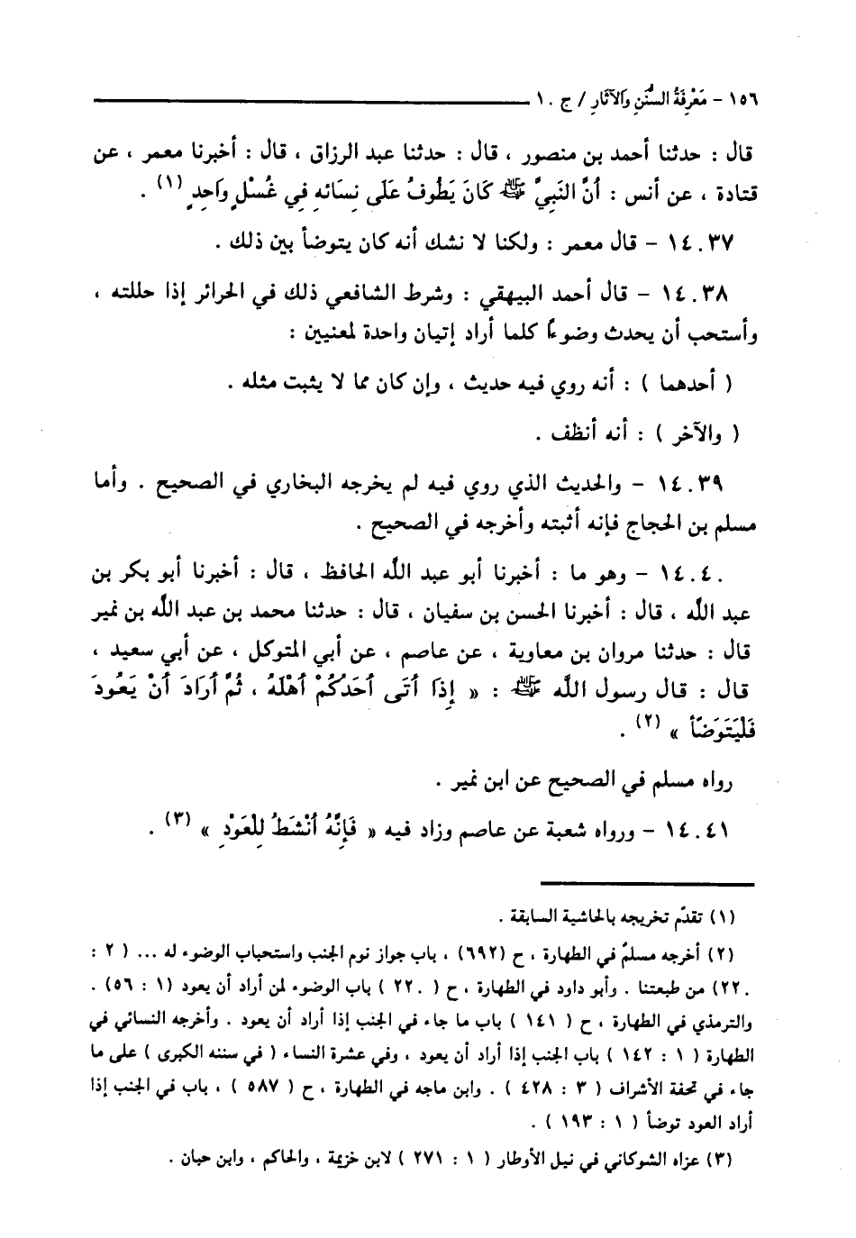 14040 - وَهُوَ مَا: أَخْبَرَنَا أَبُو عَبْدِ اللَّهِ الْحَافِظُ قَالَ: أَخْبَرَنَا أَبُو بَكْرِ بْنُ عَبْدِ اللَّهِ قَالَ: أَخْبَرَنَا الْحَسَنُ بْنُ سُفْيَانَ قَالَ: حَدَّثَنَا مُحَمَّدُ بْنُ عَبْدِ اللَّهِ بْنِ نُمَيْرٍ قَالَ: حَدَّثَنَا مَرْوَانُ بْنُ مُعَاوِيَةَ، عَنْ عَاصِمٍ، عَنْ أَبِي الْمُتَوَكِّلِ، عَنْ أَبِي سَعِيدٍ قَالَ: قَالَ رَسُولُ اللَّهِ صَلَّى اللهُ عَلَيْهِ وَسَلَّمَ: «§إِذَا أَتَى أَحَدُكُمْ أَهْلَهُ، ثُمَّ أَرَادَ أَنْ يَعُودَ فَلْيَتَوَضَّأْ» رَوَاهُ مُسْلِمٌ فِي الصَّحِيحِ عَنِ ابْنِ نُمَيْرٍ،