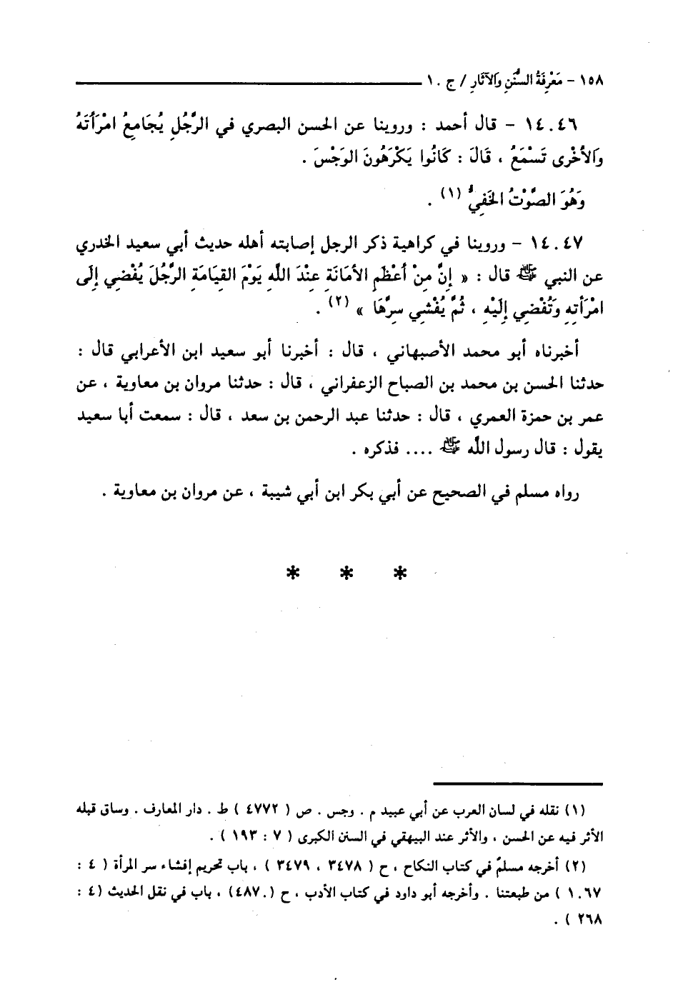 14047 - وَرُوِّينَا فِي كَرَاهِيَةِ ذِكْرِ الرَّجُلِ إِصَابَتَهُ أَهْلَهُ حَدِيثَ أَبِي سَعِيدٍ الْخُدْرِيِّ، عَنِ النَّبِيِّ صَلَّى اللهُ عَلَيْهِ وَسَلَّمَ قَالَ: «إِنَّ §مِنْ أَعْظَمِ الْأَمَانَةِ عِنْدَ اللَّهِ يَوْمَ الْقِيَامَةِ الرَّجُلُ يُفْضِي إِلَى امْرَأَتِهِ وَتُفْضِي إِلَيْهِ، ثُمَّ يُفْشِي سِرَّهَا» أَخْبَرَنَاهُ أَبُو مُحَمَّدٍ الْأَصْبَهَانِيُّ قَالَ: أَخْبَرَنَا أَبُو سَعِيدِ بْنُ الْأَعْرَابِيِّ قَالَ: حَدَّثَنَا الْحَسَنُ بْنُ مُحَمَّدِ بْنِ الصَّبَّاحِ الزَّعْفَرَانِيُّ قَالَ: حَدَّثَنَا مَرْوَانُ بْنُ مُعَاوِيَةَ، عَنْ عُمَرَ بْنِ حَمْزَةَ الْعُمَرِيِّ قَالَ: حَدَّثَنَا عَبْدُ الرَّحْمَنِ بْنُ سَعْدٍ قَالَ: سَمِعْتُ أَبَا سَعِيدٍ يَقُولُ: قَالَ رَسُولُ اللَّهِ صَلَّى اللهُ عَلَيْهِ وَسَلَّمَ، فَذَكَرَهُ رَوَاهُ مُسْلِمٌ فِي الصَّحِيحِ، عَنْ أَبِي بَكْرِ بْنِ أَبِي شَيْبَةَ، عَنْ مَرْوَانَ بْنِ مُعَاوِيَةَ