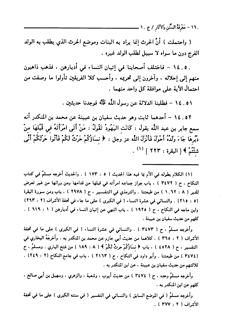 14052 - أَحَدُهُمَا ثَابِتٌ وَهُوَ حَدِيثُ سُفْيَانَ بْنِ عُيَيْنَةَ، عَنْ مُحَمَّدِ بْنِ الْمُنْكَدِرِ، أَنَّهُ سَمِعَ جَابِرَ بْنَ عَبْدِ اللَّهِ يَقُولُ: كَانَتِ الْيَهُودُ تَقُولُ: مَنْ أَتَى امْرَأَتَهُ فِي قُبُلِهَا مِنْ دُبُرِهَا جَاءَ وَلَدُهُ أَحْوَلُ، فَأَنْزَلَ اللَّهُ عَزَّ وَجَلَّ: " {§نِسَاؤُكُمْ حَرْثٌ لَكُمْ فَأْتُوا حَرْثَكُمْ أَنَّى شِئْتُمْ} [البقرة: 223]