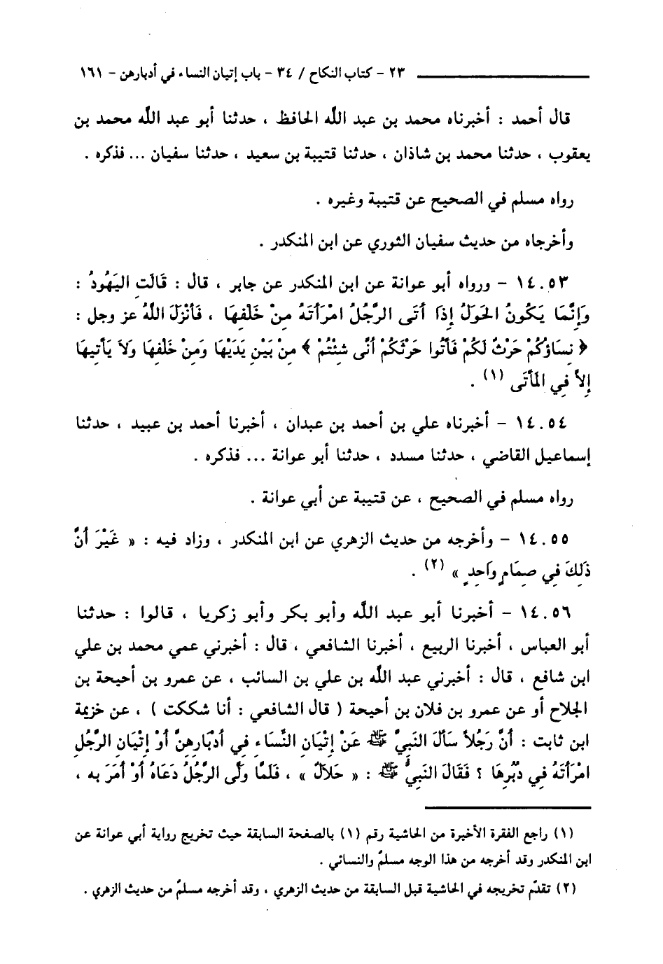 14056 - أَخْبَرَنَا أَبُو عَبْدِ اللَّهِ، وَأَبُو بَكْرٍ، وَأَبُو زَكَرِيَّا، قَالُوا: حَدَّثَنَا أَبُو الْعَبَّاسِ، أَخْبَرَنَا الرَّبِيعُ، أَخْبَرَنَا الشَّافِعِيُّ قَالَ: أَخْبَرَنِي عَمِّي مُحَمَّدُ بْنُ عَلِيِّ بْنِ شَافِعٍ قَالَ: أَخْبَرَنِي عَبْدُ اللَّهِ بْنُ عَلِيّ ٍبْنِ السَّائِبِ، عَنْ عَمْرِو بْنِ أُحَيْحَةَ بْنِ الْجُلَاحِ، أَوْ عَنْ عَمْرِو بْنِ فُلَانِ بْنِ أُحَيْحَةَ قَالَ الشَّافِعِيُّ: أَنَا شَكَكْتُ، عَنْ خُزَيْمَةَ بْنِ ثَابِتٍ: أَنَّ رَجُلًا سَأَلَ النَّبِيَّ صَلَّى اللهُ عَلَيْهِ وَسَلَّمَ عَنْ إِتْيَانِ النِّسَاءِ فِي أَدْبَارِهِنَّ أَوْ إِتْيَانِ الرَّجُلِ امْرَأَتَهُ فِي دُبُرِهَا؟ فَقَالَ النَّبِيُّ صَلَّى اللهُ عَلَيْهِ وَسَلَّمَ: «حَلَالٌ»، فَلَمَّا وَلَّى الرَّجُلُ دَعَاهُ أَوْ أَمَرَ بِهِ -[162]-، فَدُعِيَ، فَقَالَ: «كَيْفَ؟ قُلْتُ فِي أَيِّ الْخُرْبَتَيْنِ أَوْ فِي أَيِّ الْخُرْزَتَيْنِ أَوْ فِي أَيِّ الْخُصْفَتَيْنِ أَمِنْ دُبُرِهَا فِي قُبُلِهَا فَنَعَمْ، أَمِنْ دُبُرِهَا فِي دُبُرِهَا فَلَا، إِنَّ §اللَّهَ لَا يَسْتَحِي مِنَ الْحَقِّ لَا تَأْتُوا النِّسَاءَ فِي أَدْبَارِهِنَّ»
