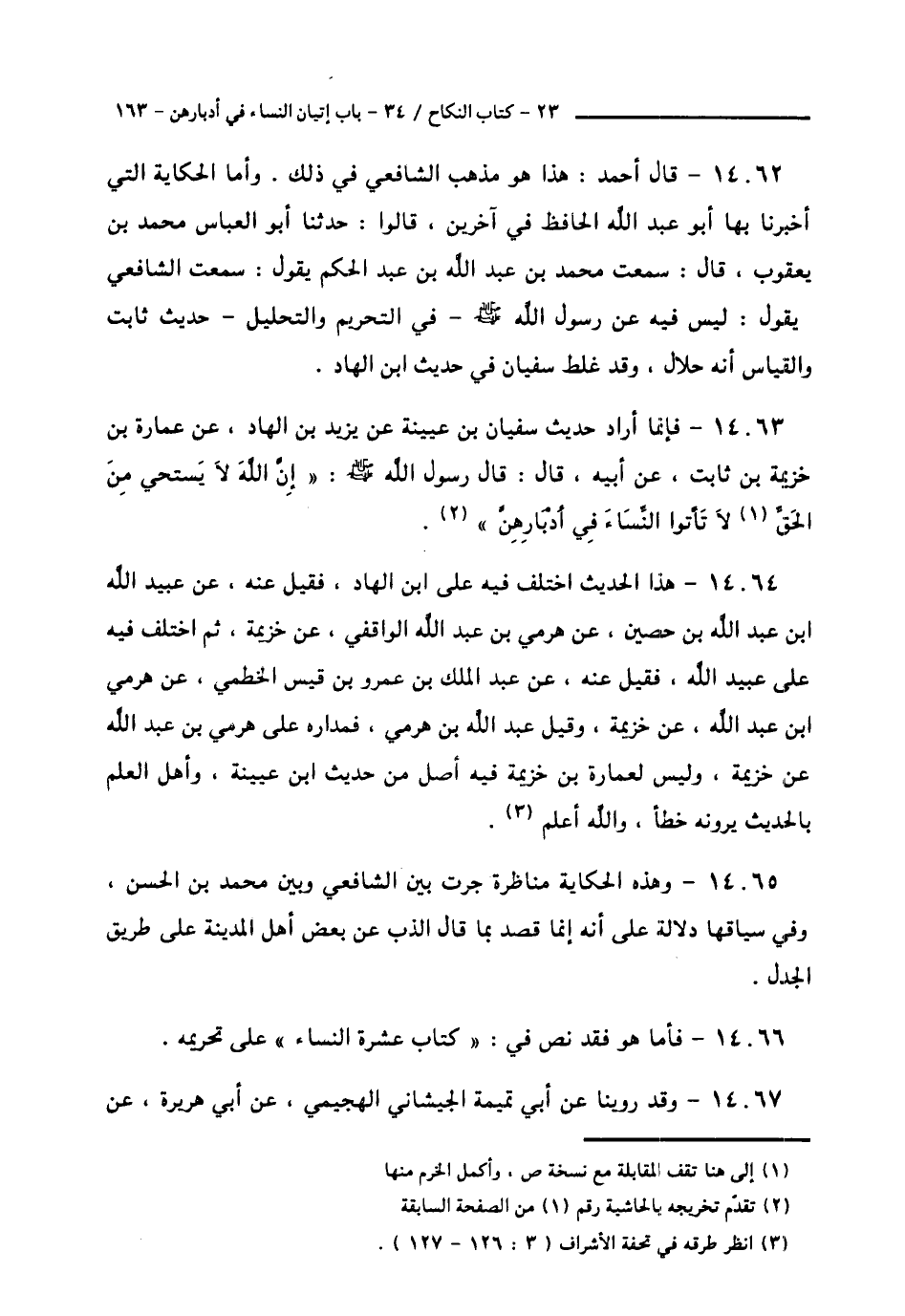 14063 - فَإِنَّمَا أَرَادَ حَدِيثَ سُفْيَانَ بْنِ عُيَيْنَةَ، عَنْ يَزِيدَ بْنِ الْهَادِ، عَنْ عُمَارَةَ بْنِ خُزَيْمَةَ بْنِ ثَابِتٍ، عَنْ أَبِيهِ قَالَ: قَالَ رَسُولُ اللَّهِ صَلَّى اللهُ عَلَيْهِ وَسَلَّمَ: «إِنَّ §اللَّهَ لَا يَسْتَحِي مِنَ الْحَقِّ لَا تَأْتُوا النِّسَاءَ فِي أَدْبَارِهِنَّ»