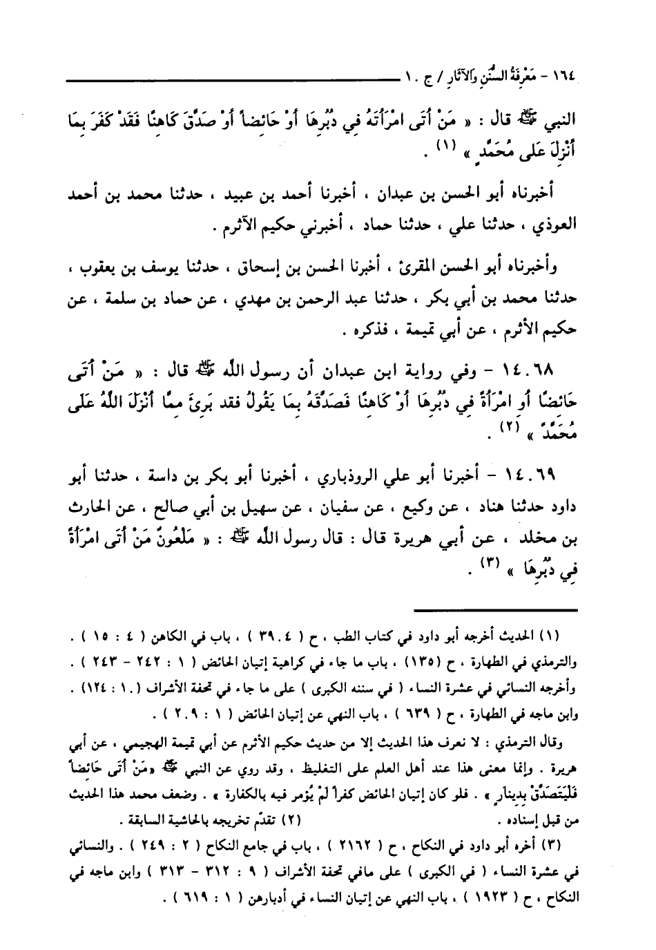 14069 - أَخْبَرَنَا أَبُو عَلِيٍّ الرُّوذْبَارِيُّ، أَخْبَرَنَا أَبُو بَكْرِ بْنُ دَاسَةَ، حَدَّثَنَا أَبُو دَاوُدَ، حَدَّثَنَا هَنَّادٌ، عَنْ وَكِيعٍ، عَنْ سُفْيَانَ، عَنْ سُهَيْلِ بْنِ أَبِي صَالِحٍ، عَنِ الْحَارِثِ بْنِ مَخْلَدٍ، عَنْ أَبِي هُرَيْرَةَ قَالَ: قَالَ رَسُولُ اللَّهِ صَلَّى اللهُ عَلَيْهِ وَسَلَّمَ: § «مَلْعُونٌ مَنْ أَتَى امْرَأَةً فِي دُبُرِهَا»