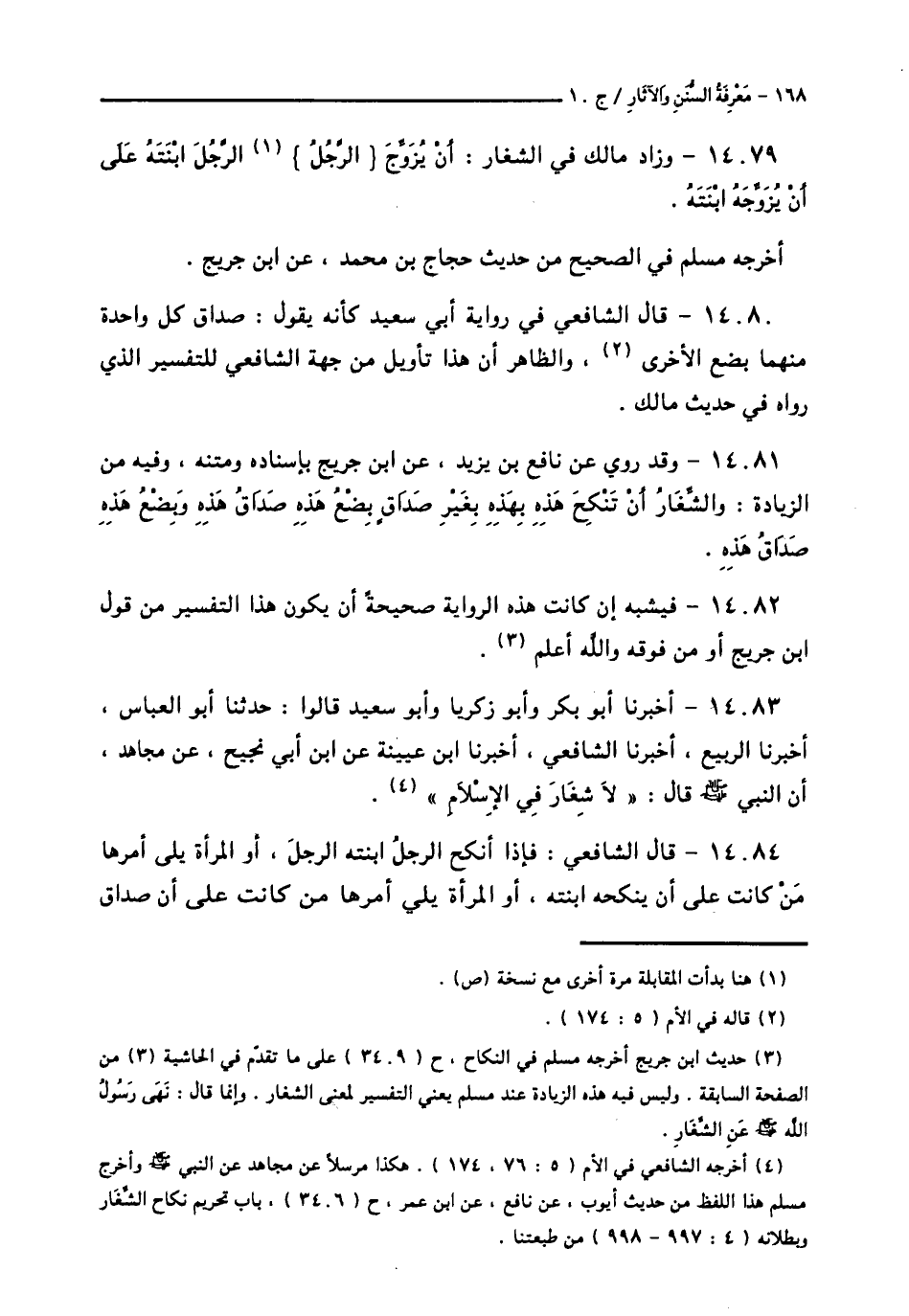 14083 - أَخْبَرَنَا أَبُو بَكْرٍ، وَأَبُو زَكَرِيَّا، وَأَبُو سَعِيدٍ، قَالُوا: حَدَّثَنَا أَبُو الْعَبَّاسِ، أَخْبَرَنَا الرَّبِيعُ، أَخْبَرَنَا الشَّافِعِيُّ، أَخْبَرَنَا ابْنُ عُيَيْنَةَ، عَنِ بْنِ أَبِي نَجِيحٍ، عَنْ مُجَاهِدٍ، أَنَّ النَّبِيَّ صَلَّى اللهُ عَلَيْهِ وَسَلَّمَ قَالَ: «§لَا شِغَارَ فِي الْإِسْلَامِ»