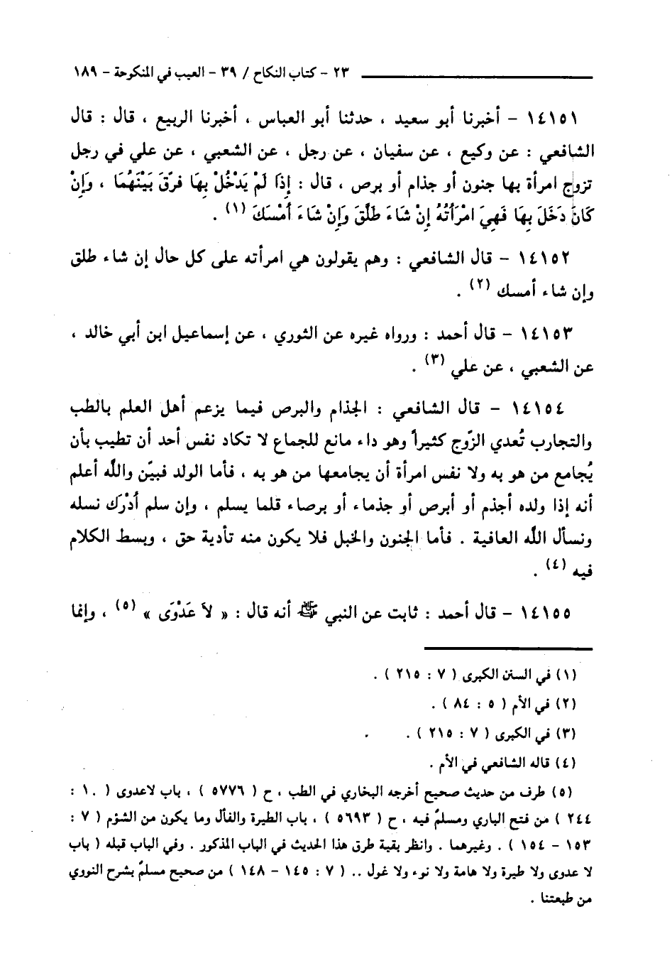 14154 - قَالَ الشَّافِعِيُّ: الْجُذَامُ وَالْبَرَصُ فِيمَا يَزْعُمُ أَهْلُ الْعِلْمِ بِالطِّبِّ وَالتَّجَارِبِ تُعْدِي الزَّوْجَ كَثِيرًا وَهُوَ دَاءٌ مَانِعٌ لِلْجِمَاعِ لَا تَكَادُ نَفْسُ أَحَدٍ أَنْ تَطِيبَ بِأَنْ يُجَامِعَ مَنْ هُوَ بِهِ وَلَا نَفْسُ امْرَأَةٍ أَنْ يُجَامِعَهَا مَنْ هُوَ بِهِ، فَأَمَّا الْوَلَدُ فَبَيِّنٌ وَاللَّهُ أَعْلَمُ أَنَّهُ إِذَا وَلَدَهُ أَجْذَمُ أَوْ أَبْرَصُ أَوْ جَذْمَاءُ أَوْ بَرْصَاءُ قَلَّمَا يَسْلِمُ، وَإِنْ سَلَمَ أَدْرَكَ نَسْلَهُ وَنَسْأَلُ اللَّهَ الْعَافِيَةَ، فَأَمَّا الْجُنُونُ وَالْخَبَلُ فَلَا يَكُونُ مِنْهُ تَأْدِيَةُ حَقٍّ، وَبَسَطَ الْكَلَامَ فِيهِ