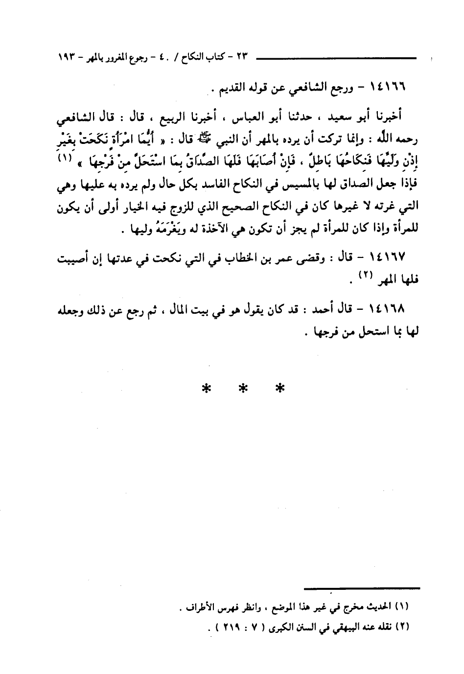 14166 - وَرَجَعَ الشَّافِعِيُّ عَنْ قَوْلِهِ الْقَدِيمِ، أَخْبَرَنَا أَبُو سَعِيدٍ، حَدَّثَنَا أَبُو الْعَبَّاسِ، أَخْبَرَنَا الرَّبِيعُ قَالَ: قَالَ الشَّافِعِيُّ رَحِمَهُ اللَّهُ: وَإِنَّمَا تَرَكْتُ أَنْ يَرُدَّهُ بِالْمَهْرِ أَنَّ النَّبِيَّ صَلَّى اللهُ عَلَيْهِ وَسَلَّمَ قَالَ: «§أَيُّمَا امْرَأَةٍ نَكَحَتْ بِغَيْرِ إِذْنِ وَلِيِّهَا فَنِكَاحُهَا بَاطِلٌ، فَإِنْ أَصَابَهَا فَلَهَا الصَّدَاقُ بِمَا اسْتَحَلَّ مِنْ فَرْجِهَا» فَإِذَا جَعَلَ الصَّدَاقَ لَهَا بِالْمَسِيسِ فِي النِّكَاحِ الْفَاسِدِ بِكُلِّ حَالٍ وَلَمْ يَرُدَّهُ بِهِ عَلَيْهَا وَهِيَ الَّتِي غَرَّتْهُ لَا غَيْرُهَا كَانَ فِي النِّكَاحِ الصَّحِيحِ الَّذِي لِلزَّوْجِ فِيهِ الْخِيَارُ أَوْلَى أَنْ يَكُونَ لِلْمَرْأَةِ وَإِذَا كَانَ لِلْمَرْأَةِ لَمْ يُجَزْ أَنْ تَكُونَ هِيَ الْآخِذَةُ لَهُ وَيُغْرَمُهُ وَلِيُّهَا