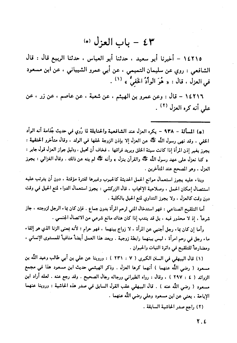 14217 - قَالَ الشَّافِعِيُّ: وَلَيْسُوا يَأْخُذُونَ بِهَذَا وَلَا يَرَوْنَ بِالْعَزْلِ بَأْسًا، أَوْرَدَهُ فِيمَا خَالَفَ الْعِرَاقِيُّونَ عَلِيًّا، وَعَبْدَ اللَّهِ