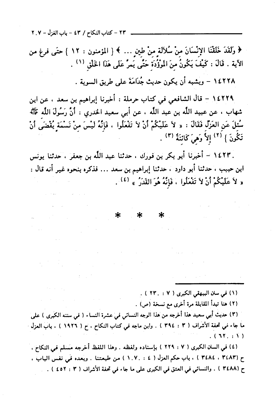 14229 - قَالَ الشَّافِعِيُّ فِي كِتَابِ حَرْمَلَةَ: أَخْبَرَنَا إِبْرَاهِيمُ بْنُ سَعْدٍ، عَنِ ابْنِ شِهَابٍ، عَنْ عُبَيْدِ اللَّهِ بْنِ عَبْدِ اللَّهِ، عَنْ أَبِي سَعِيدٍ الْخُدْرِيِّ، أَنَّ رَسُولَ اللَّهِ صَلَّى اللهُ عَلَيْهِ وَسَلَّمَ سُئِلَ عَنِ الْعَزْلِ فَقَالَ: «§لَا عَلَيْكُمْ أَنْ لَا تَفْعَلُوا، فَإِنَّهُ لَيْسَ مِنْ نَسْمَةٍ يُقْضَى أَنْ تَكُونَ إِلَّا وَهِيَ كَائِنَةٌ»،
