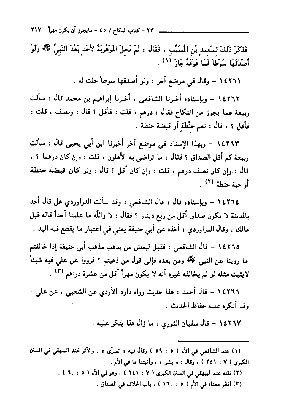 14262 - وَبِإِسْنَادِهِ أَخْبَرَنَا الشَّافِعِيُّ، أَخْبَرَنَا إِبْرَاهِيمُ بْنُ مُحَمَّدٍ قَالَ: سَأَلْتُ رَبِيعَةَ عَمَّا §يَجُوزُ مِنَ النِّكَاحِ فَقَالَ: «دِرْهَمٌ»، قُلْتُ: فَأَقَلُّ؟ قَالَ: «وَنِصْفٌ»، قُلْتُ: فَأَقَلُّ؟ قَالَ: «نَعَمْ، حِنْطَةٌ أَوْ قَبْضَةُ حِنْطَةٍ»
