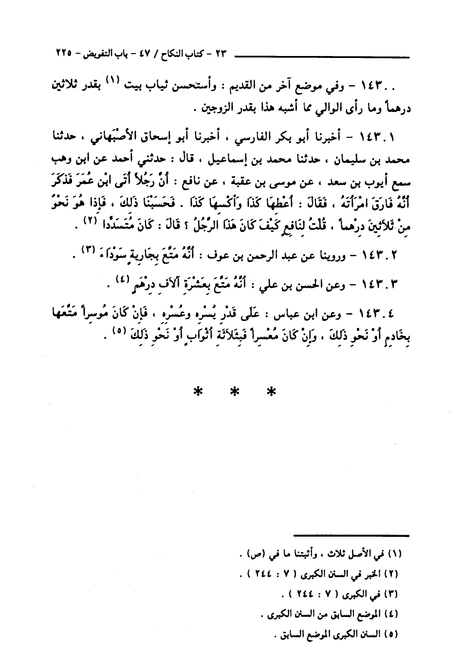 14301 - أَخْبَرَنَا أَبُو بَكْرٍ الْفَارِسِيُّ، أَخْبَرَنَا أَبُو إِسْحَاقَ الْأَصْبَهَانِيُّ، حَدَّثَنَا مُحَمَّدُ بْنُ سُلَيْمَانَ، حَدَّثَنَا مُحَمَّدُ بْنُ إِسْمَاعِيلَ قَالَ: حَدَّثَنِي أَحْمَدُ، عَنِ ابْنِ وَهْبٍ، سَمِعَ أَيُّوبَ بْنَ سَعْدٍ، عَنْ مُوسَى بْنِ عُقْبَةَ، عَنْ نَافِعٍ، أَنَّ رَجُلًا أَتَى ابْنَ عُمَرَ فَذَكَرَ أَنَّهُ §فَارَقَ امْرَأَتَهُ، فَقَالَ: «أَعْطِهَا كَذَا، وَأَكْسِهَا كَذَا»، فَحَسْبُنَا ذَلِكَ، فَإِذَا هُوَ نَحْوٌ مِنْ ثَلَاثِينَ دِرْهَمًا، قُلْتُ لِنَافِعٍ: كَيْفَ كَانَ هَذَا الرَّجُلُ؟ قَالَ: كَانَ مُتَسَدِّدًا،