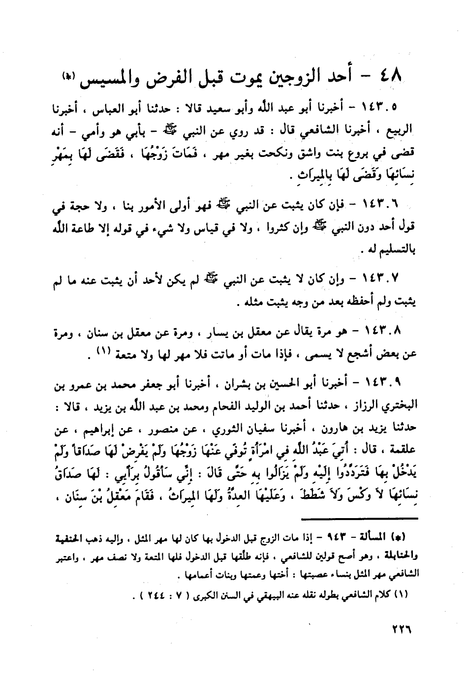 14305 - أَخْبَرَنَا أَبُو عَبْدِ اللَّهِ، وَأَبُو سَعِيدٍ قَالَا: حَدَّثَنَا أَبُو الْعَبَّاسِ، أَخْبَرَنَا الرَّبِيعُ، أَخْبَرَنَا الشَّافِعِيُّ قَالَ: قَدْ رُوِيَ عَنِ النَّبِيِّ صَلَّى اللهُ عَلَيْهِ وَسَلَّمَ - بِأَبِي هُوَ وَأُمِّي - أَنَّهُ «§قَضَى فِي بَرْوَعَ بِنْتِ وَاشِقٍ وَنُكِحَتْ بِغَيْرِ مَهْرٍ، فَمَاتَ زَوْجُهَا، فَقَضَى لَهَا بِمَهْرِ نِسَائِهَا وَقَضَى لَهَا بِالْمِيرَاثِ»،