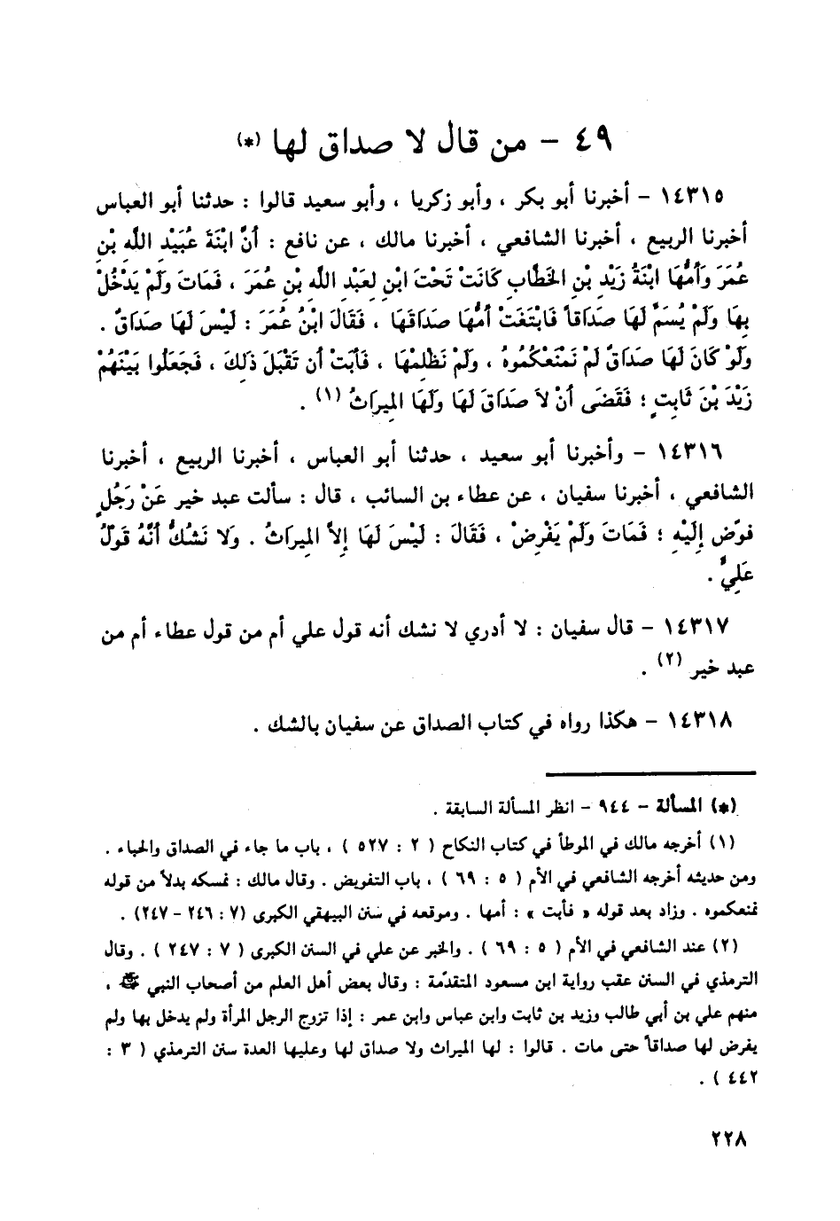14315 - أَخْبَرَنَا أَبُو بَكْرٍ، وَأَبُو زَكَرِيَّا، وَأَبُو سَعِيدٍ، قَالُوا: حَدَّثَنَا أَبُو الْعَبَّاسِ، أَخْبَرَنَا الرَّبِيعُ، أَخْبَرَنَا الشَّافِعِيُّ، أَخْبَرَنَا مَالِكٌ، عَنْ نَافِعٍ، أَنَّ ابْنَةَ عُبَيْدِ اللَّهِ بْنِ عُمَرَ، وَأُمَّهَا ابْنَةَ زَيْدِ بْنِ الْخَطَّابِ، كَانَتْ تَحْتَ ابْنٍ لِعَبْدِ اللَّهِ بْنِ عُمَرَ، فَمَاتَ وَلَمْ يَدْخُلْ بِهَا وَلَمْ يُسَمِّ لَهَا صَدَاقًا فَابْتَغَتْ أُمُّهَا صَدَاقَهَا، فَقَالَ ابْنُ عُمَرَ: «§لَيْسَ لَهَا صَدَاقٌ وَلَوْ كَانَ لَهَا صَدَاقٌ لَمْ نَمْنَعْكُمُوهُ، وَلَمْ نَظْلِمْهَا»، فَأَبَتْ أَنْ تَقْبَلَ ذَلِكَ، فَجَعَلُوا بَيْنَهُمْ زَيْدَ بْنَ ثَابِتٍ، فَقَضَى «أَنْ لَا صَدَاقَ لَهَا وَلَهَا الْمِيرَاثُ»