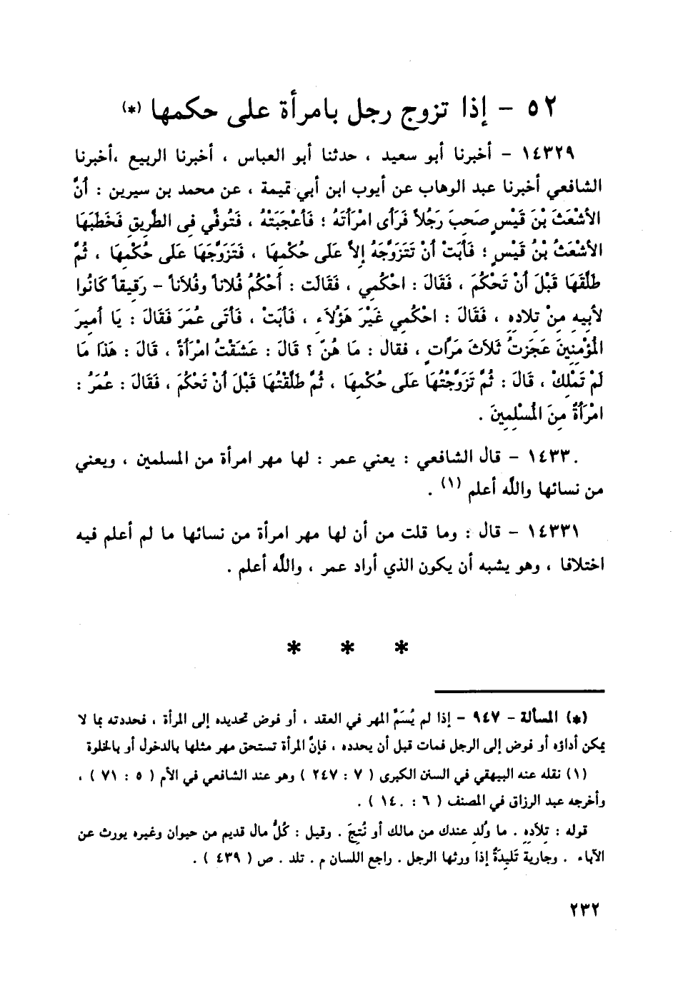 14329 - أَخْبَرَنَا أَبُو سَعِيدٍ، حَدَّثَنَا أَبُو الْعَبَّاسِ، أَخْبَرَنَا الرَّبِيعُ، أَخْبَرَنَا الشَّافِعِيُّ، أَخْبَرَنَا عَبْدُ الْوَهَّابِ، عَنْ أَيُّوبَ بْنِ أَبِي تَمِيمَةَ، عَنْ مُحَمَّدِ بْنِ سِيرِينَ، أَنَّ الْأَشْعَثَ بْنَ قَيْسٍ صَحِبَ رَجُلًا فَرَأَى امْرَأَتَهُ، فَأَعْجَبَتْهُ، فَتُوُفِّيَ فِي الطَّرِيقِ فَخَطَبَهَا الْأَشْعَثُ بْنُ قَيْسٍ، فَأَبَتْ أَنْ تَتَزَوَّجَهُ إِلَّا عَلَى حُكْمِهَا، فَتَزَوَّجَهَا عَلَى حُكْمِهَا، ثُمَّ طَلَّقَهَا قَبْلَ أَنْ تَحْكُمَ، فَقَالَ: احْكُمِي، فَقَالَتْ: أُحْكِمُ فُلَانًا وَفُلَانًا - رَقِيقًا كَانُوا لِأَبِيهِ مِنْ تِلَادِهِ، فَقَالَ: احْكُمِي غَيْرَ هَؤُلَاءِ، فَأَبَتْ، فَأَتَى عُمَرَ فَقَالَ: يَا أَمِيرَ الْمُؤْمِنِينَ، §عَجَزْتُ ثَلَاثَ مَرَّاتٍ، فَقَالَ: «مَا هُنَّ؟» قَالَ: عَشَقْتُ امْرَأَةً قَالَ: «هَذَا مَا لَمْ تَمْلِكْ» قَالَ: تَزَوَّجْتُهَا عَلَى حُكْمِهَا، ثُمَّ طَلَّقْتُهَا قَبْلَ أَنْ تَحْكُمَ، فَقَالَ عُمَرُ: امْرَأَةٌ مِنَ الْمُسْلِمِينَ،