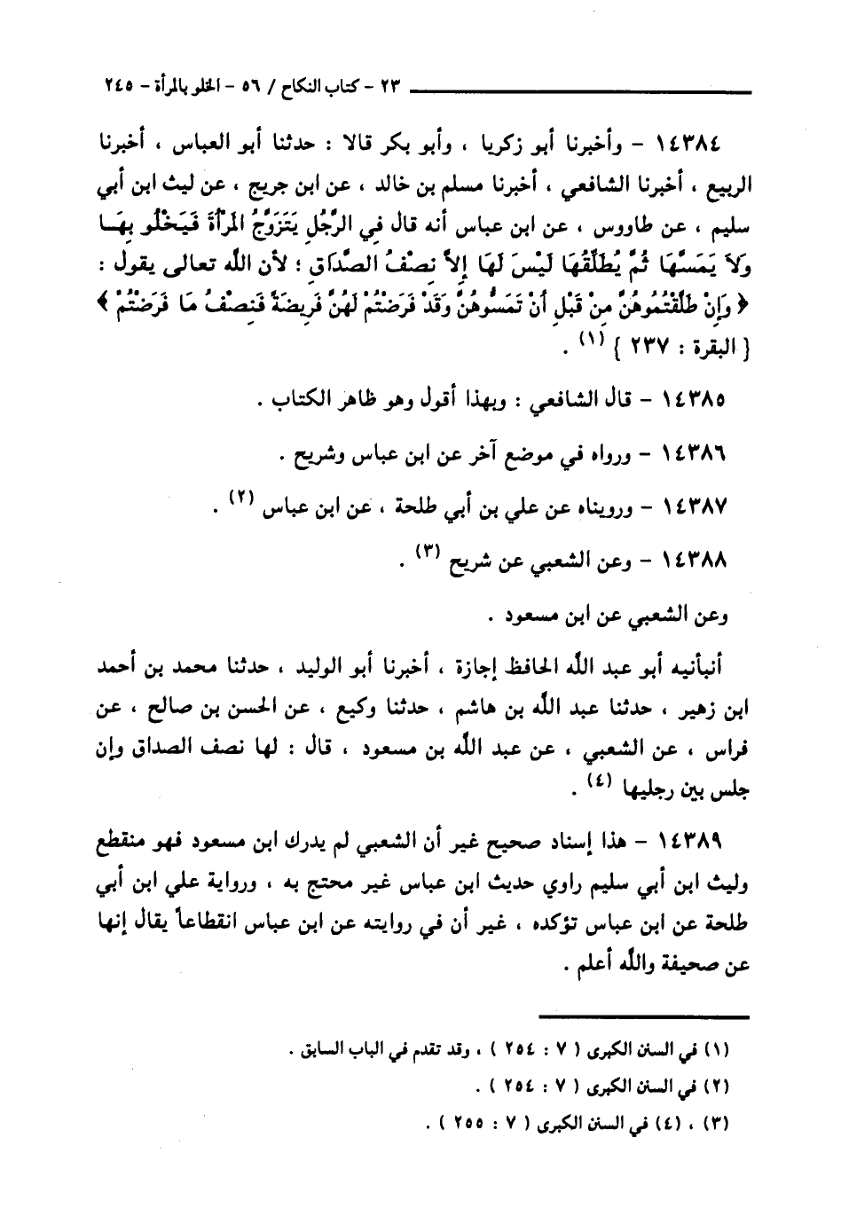 14384 - وَأَخْبَرَنَا أَبُو زَكَرِيَّا، وَأَبُو بَكْرٍ قَالَا: حَدَّثَنَا أَبُو الْعَبَّاسِ، أَخْبَرَنَا الرَّبِيعُ، أَخْبَرَنَا الشَّافِعِيُّ، أَخْبَرَنَا مُسْلِمُ بْنُ خَالِدٍ، عَنِ ابْنِ جُرَيْجٍ، عَنْ لَيْثِ بْنِ أَبِي سُلَيْمٍ، عَنْ طَاوُسٍ، عَنِ ابْنِ عَبَّاسٍ أَنَّهُ قَالَ فِي §الرَّجُلِ يَتَزَوَّجُ الْمَرْأَةَ فَيَخْلُو بِهَا وَلَا يَمَسُّهَا ثُمَّ يُطَلِّقُهَا: " لَيْسَ لَهَا إِلَّا نِصْفُ الصَّدَاقِ؛ لِأَنَّ اللَّهَ تَعَالَى يَقُولُ: {وَإِنْ طَلَّقْتُمُوهُنَّ مِنْ قَبْلِ أَنْ تَمَسُّوهُنَّ وَقَدْ فَرَضْتُمْ لَهُنَّ فَرِيضَةً فَنِصْفُ مَا فَرَضْتُمْ} [البقرة: 237] "