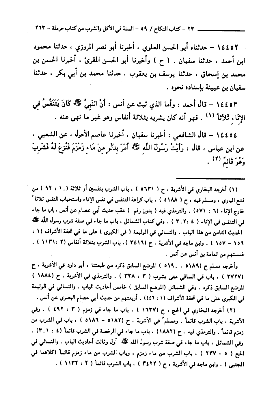 14453 - قَالَ أَحْمَدُ: وَأَمَّا الَّذِي ثَبَتَ، عَنْ أَنَسٍ، «أَنَّ النَّبِيَّ صَلَّى اللهُ عَلَيْهِ وَسَلَّمَ §كَانَ يَتَنَفَّسُ فِي الْإِنَاءِ ثَلَاثًا»، فَهُوَ أَنَّهُ كَانَ يَشْرَبُهُ بِثَلَاثَةِ أَنْفَاسٍ وَهُوَ غَيْرُ مَا نَهَى عَنْهُ