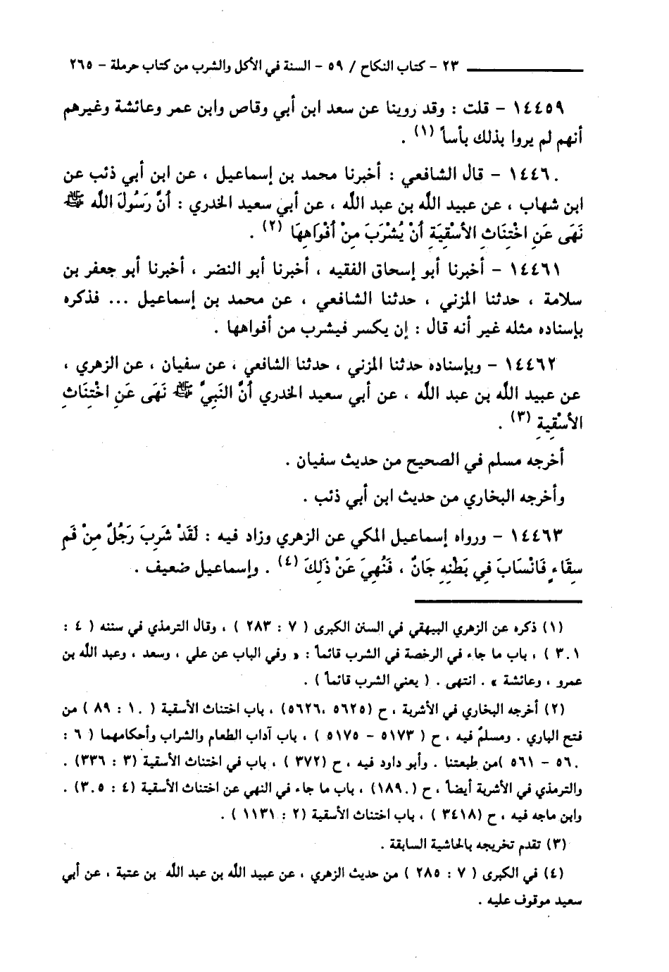 14460 - قَالَ الشَّافِعِيُّ: أَخْبَرَنَا مُحَمَّدُ بْنُ إِسْمَاعِيلَ، عَنِ ابْنِ أَبِي ذِئْبٍ، عَنِ ابْنِ شِهَابٍ، عَنْ عُبَيْدِ اللَّهِ بْنِ عَبْدِ اللَّهِ، عَنْ أَبِي سَعِيدٍ الْخُدْرِيِّ، «أَنَّ رَسُولَ اللَّهِ صَلَّى اللهُ عَلَيْهِ وَسَلَّمَ §نَهَى عَنِ اخْتِنَاثِ الْأَسْقِيَةِ أَنْ يُشْرَبَ مِنْ أَفْوَاهِهَا»