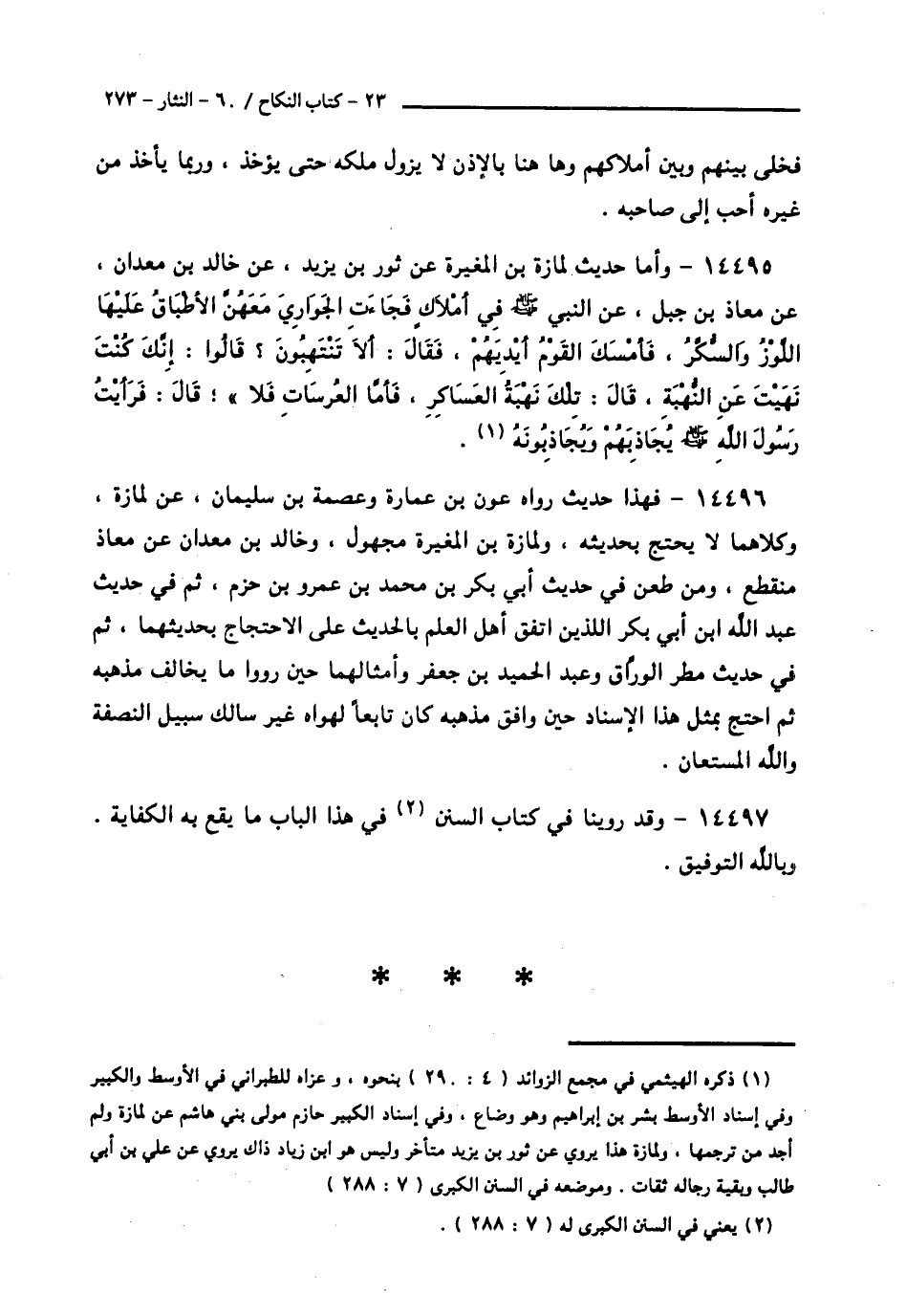 14496 - فَهَذَا حَدِيثٌ رَوَاهُ عَوْنُ بْنُ عُمَارَةَ، وَعِصْمَةُ بْنُ سُلَيْمَانَ، عَنْ لُمَازَةَ، وَكِلَاهُمَا لَا يُحْتَجُّ بِحَدِيثِهِ، وَلُمَازَةُ بْنُ الْمُغِيرَةِ مَجْهُوَلٌ، وَخَالِدُ بْنُ مَعْدَانَ، عَنْ مُعَاذٍ، مُنْقَطِعٌ، وَمَنْ طَعَنَ فِي حَدِيثِ أَبِي بَكْرِ بْنِ مُحَمَّدِ بْنِ عَمْرِو بْنِ حَزْمٍ، ثُمَّ فِي حَدِيثِ عَبْدِ اللَّهِ بْنِ أَبِي بَكْرٍ اللَّذَيْنِ اتَّفَقَ أَهْلُ الْعِلْمِ بِالْحَدِيثِ عَلَى الِاحْتِجَاجِ بِحَدِيثِهِمَا، ثُمَّ فِي حَدِيثِ مَطَرٍ الْوَرَّاقِ، وَعَبْدِ الْحَمِيدِ بْنِ جَعْفَرٍ وَأَمْثَالِهِمَا حِينَ رَوَوْا مَا يُخَالِفُ مُذْهَبَهُ ثُمَّ يَحْتَجُّ بِمِثْلِ هَذَا الْإِسْنَادِ حِينَ وَافَقَ مَذْهَبَهُ كَانَ تَابِعًا لِهَوَاهُ غَيْرُ سَالِكٍ سَبِيلَ النُّصْفَةِ وَاللَّهُ الْمُسْتَعَانُ،