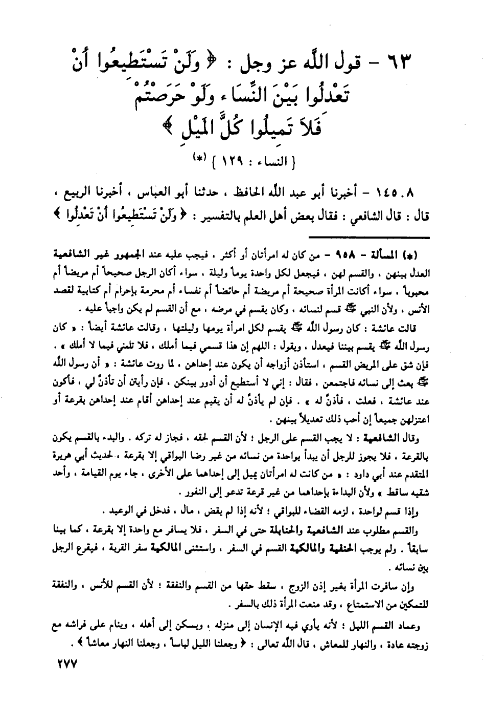 14509 - قَالَ: وَدَلَّتْ سُنَّةُ رَسُولِ اللَّهِ صَلَّى اللهُ عَلَيْهِ وَسَلَّمَ وَمَا عَلَيْهِ عَوَامُّ عُلَمَاءِ الْمُسْلِمِينَ عَلَى أَنَّ عَلَى الرَّجُلِ أَنْ يَقْسِمَ لِنِسَائِهِ بِعَدَدِ الْأَيَّامِ وَاللَّيَالِي، وَأَنَّ عَلَيْهِ أَنْ يَعْدِلَ فِي ذَلِكَ لَا أَنَّهُ مُرَخَّصٌ لَهُ أَنْ يَجُوزَ فِيهِ، فَدَلَّ ذَلِكَ عَلَى أَنَّهُ إِنَّمَا أُرِيدَ بِهِ مَا فِي الْقُلُوبِ مِمَّا قَدْ تَجَاوَزَ اللَّهُ لِلْعِبَادِ عَنْهُ فِيمَا هُوَ أَعْظَمُ مِنَ الْمَيْلِ عَلَى النِّسَاءِ، وَاللَّهُ أَعْلَمُ.