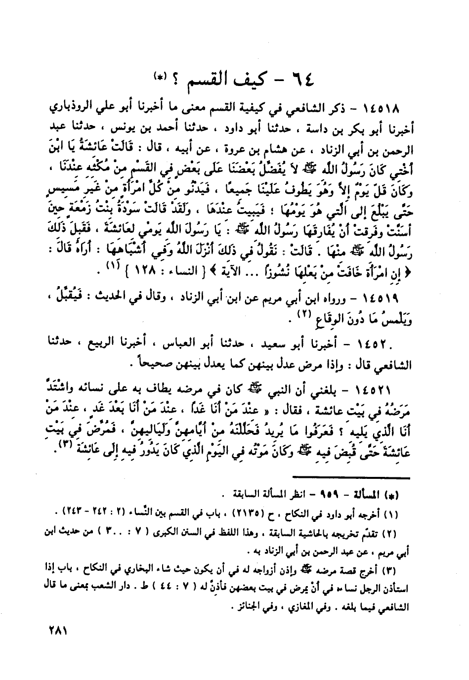 14518 - ذَكَرَ الشَّافِعِيُّ فِي كَيْفِيَّةِ الْقَسْمِ مَعْنَى مَا أَخْبَرَنَا أَبُو عَلِيٍّ الرُّوذْبَارِيُّ، أَخْبَرَنَا أَبُو بَكْرِ بْنُ دَاسَةَ، حَدَّثَنَا أَبُو دَاوُدَ، حَدَّثَنَا أَحْمَدُ بْنُ يُونُسَ، حَدَّثَنَا عَبْدُ الرَّحْمَنِ بْنُ أَبِي الزِّنَادِ، عَنْ هِشَامِ بْنِ عُرْوَةَ، عَنْ أَبِيهِ قَالَ: قَالَتْ عَائِشَةُ: يَا ابْنَ أُخْتِي، «كَانَ رَسُولُ اللَّهِ صَلَّى اللهُ عَلَيْهِ وَسَلَّمَ §لَا يُفَضِّلُ بَعْضَنَا عَلَى بَعْضٍ فِي الْقَسْمِ مِنْ مُكْثِهِ عِنْدَنَا، وَكَانَ قَلَّ يَوْمٌ إِلَّا وَهُوَ يَطُوفَ عَلَيْنَا جَمِيعًا، فَيَدْنُو مِنْ كُلِّ امْرَأَةٍ مِنْ غَيْرِ مَسِيسٍ حَتَّى يَبْلُغَ إِلَى الَّتِي هُوَ يَوْمُهَا، فَيَبِيتُ عِنْدَهَا»، وَلَقَدْ قَالَتْ سَوْدَةُ بِنْتُ زَمْعَةَ حِينَ أَسَنَّتْ وَفَرِقَتْ أَنْ يُفَارِقَهَا رَسُولُ اللَّهِ صَلَّى اللهُ عَلَيْهِ وَسَلَّمَ: يَا رَسُولَ اللَّهِ، يَوْمِي لِعَائِشَةَ، فَقَبِلَ ذَلِكَ رَسُولُ اللَّهِ صَلَّى اللهُ عَلَيْهِ وَسَلَّمَ مِنْهَا قَالَتْ: نَقُولُ فِي ذَلِكَ أَنْزَلَ اللَّهُ وَفِي أَشْبَاهِهَا: أُرَاهُ قَالَ: {إِنِ امْرَأَةٌ خَافَتْ مِنْ بَعْلِهَا نُشُوزًا} [النساء: 128]