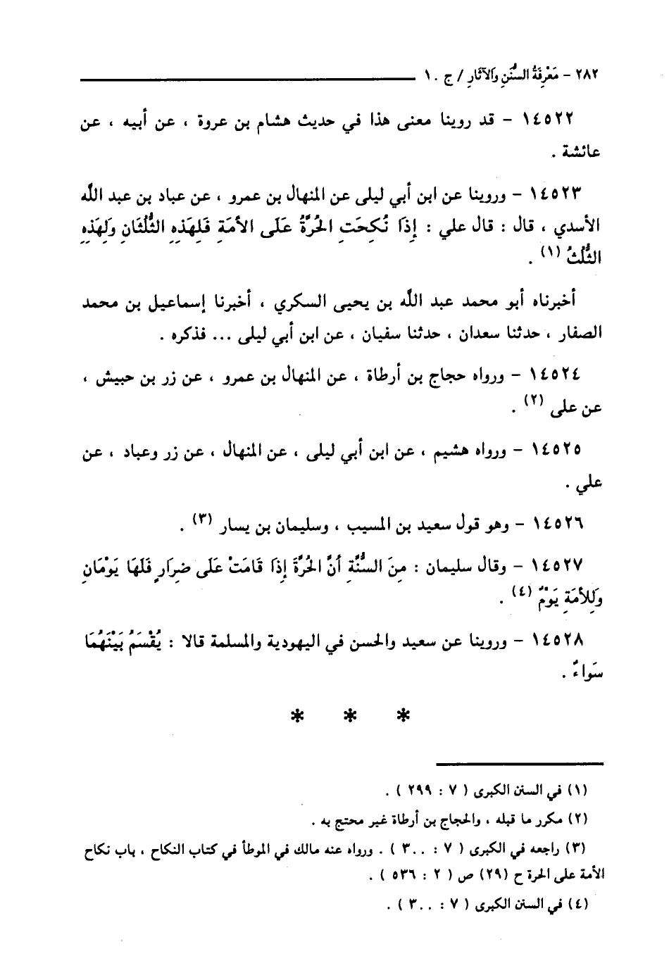 14523 - وَرُوِّينَا عَنِ ابْنِ أَبِي لَيْلَى، عَنِ الْمِنْهَالِ بْنِ عَمْرٍو، عَنْ عَبَّادِ بْنِ عَبْدِ اللَّهِ الْأَسَدِيِّ قَالَ: قَالَ عَلِيٌّ: § «إِذَا نُكِحَتِ الْحَرَّةُ عَلَى الْأَمَةِ فَلِهَذِهِ الثُّلُثَانِ وَلِهَذِهِ الثُّلُثُ» أَخْبَرَنَاهُ أَبُو مُحَمَّدٍ عَبْدُ اللَّهِ بْنُ يَحْيَى السُّكَّرِيُّ، أَخْبَرَنَا إِسْمَاعِيلُ بْنُ مُحَمَّدٍ الصَّفَّارُ، حَدَّثَنَا سَعْدَانُ، حَدَّثَنَا سُفْيَانُ، عَنِ ابْنِ أَبِي لَيْلَى، فَذَكَرَهُ،