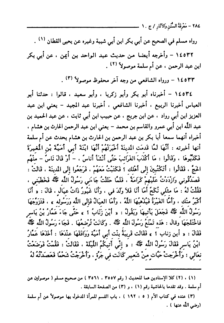 14534 - أَخْبَرَنَاهُ أَبُو بَكْرٍ، وَأَبُو زَكَرِيَّا، وَأَبُو سَعِيدٍ، قَالُوا: حَدَّثَنَا أَبُو الْعَبَّاسِ، أَخْبَرَنَا الرَّبِيعُ، أَخْبَرَنَا الشَّافِعِيُّ، أَخْبَرَنَا عَبْدُ الْمَجِيدِ يَعْنِي ابْنَ عَبْدِ الْعَزِيزِ بْنِ أَبِي رَوَّادٍ، عَنِ ابْنِ جُرَيْجٍ، عَنْ حَبِيبِ بْنِ أَبِي ثَابِتٍ، عَنْ عَبْدِ الْحَمِيدِ بْنِ عَبْدِ اللَّهِ بْنِ أَبِي عَمْرٍو، وَالْقَاسِمِ بْنِ مُحَمَّدٍ يَعْنِي ابْنَ عَبْدِ الرَّحْمَنِ الْحَارِثَ بْنَ هِشَامٍ أَخْبَرَاهُ، أَنَّهُمَا سَمِعَا أَبَا بَكْرِ بْنَ عَبْدِ الرَّحْمَنِ بْنِ الْحَارِثِ بْنِ هِشَامٍ يُحَدِّثُ، عَنْ أُمِّ سَلَمَةَ أَنَّهَا أَخْبَرَتْهُ: أَنَّهَا لَمَّا قَدِمَتِ الْمَدِينَةَ أَخْبَرَتْهُمْ أَنَّهَا ابْنَةُ أَبِي أُمَيَّةَ بْنِ الْمُغِيرَةِ، فَكَذَّبُوهَا، وَقَالُوا: مَا أَكْذَبَ الْغَرَائِبَ حَتَّى أَنْشَأَ أُنَاسٌ، - أَوْ قَالَ نَاسٌ - مِنْهُمُ الْحَجَّ، فَقَالُوا: أَتَكْتُبِينَ إِلَى أَهْلِكِ؟ فَكَتَبْتُ مَعَهُمْ، فَرَجَعُوا إِلَى الْمَدِينَةِ قَالَتْ: فَصَدَّقُونِي وَازْدَدْتُ عَلَيْهِمْ كَرَامَةً، فَلَمَّا حَلَلْتُ جَاءَنِي رَسُولُ اللَّهِ صَلَّى اللهُ عَلَيْهِ وَسَلَّمَ فَخَطَبَنِي، فَقُلْتُ لَهُ: مَا مِثْلِي نُكَحٌ أَمَّا أَنَا فَلَا وَلَدَ فِيَّ، وَأَنَا غَيُورٌ ذَاتُ عِيَالٍ قَالَ: «§أَنَا أَكْبَرُ مِنْكِ، وَأَمَّا الْغَيْرَةُ فَيُذْهِبُهَا اللَّهُ، وَأَمَّا الْعِيَالُ فَإِلَى اللَّهِ وَرَسُولِهِ»، فَتَزَوَّجَهَا رَسُولُ اللَّهِ صَلَّى اللهُ عَلَيْهِ وَسَلَّمَ فَجَعَلَ يَأْتِيهَا وَيَقُولُ: «أَيْنَ زُنَابُ؟»، حَتَّى جَاءَ عَمَّارُ بْنُ يَاسِرٍ فَاخْتَلَجَهَا وَقَالَ: هَذِهِ تَمْنَعُ رَسُولَ اللَّهِ صَلَّى اللهُ عَلَيْهِ وَسَلَّمَ وَكَانَتْ تُرْضِعُهَا فَجَاءَ رَسُولَ اللَّهِ صَلَّى اللهُ عَلَيْهِ وَسَلَّمَ فَقَالَ: «أَيْنَ زُنَابُ؟»، فَقَالَتْ قُرَيْبَةُ بِنْتُ أَبِي أُمَيَّةَ وَوَافَقَهَا عِنْدَهَا: أَخَذَهَا عَمَّارُ بْنُ يَاسِرٍ، فَقَالَ رَسُولُ اللَّهِ صَلَّى اللهُ عَلَيْهِ وَسَلَّمَ: «إِنِّي آتِيكُمُ اللَّيْلَةَ»، فَقَالَتْ: فَقُمْتُ فَوَضَعْتُ نِعَالِي، وَأَخْرَجْتُ حَبَّاتٍ مِنْ شَعِيرٍ كَانَتْ فِي جَرَّةٍ، وَأَخْرَجْتُ شَحْمًا فَعَصَدْتُهُ لَهُ -[285]- أَوْ صَعَدْتُهُ قَالَتْ: فَبَاتَ رَسُولُ اللَّهِ صَلَّى اللهُ عَلَيْهِ وَسَلَّمَ وَأَصْبَحَ، فَقَالَ حِينَ أَصْبَحَ: «إِنَّ لَكِ عَلَى أَهْلِكِ كَرَامَةً، فَإِنْ شِئْتِ سَبَّعْتُ لَكِ، وَإِنْ أُسَبِّعْ أُسَبِّعْ لِنِسَائِي»
