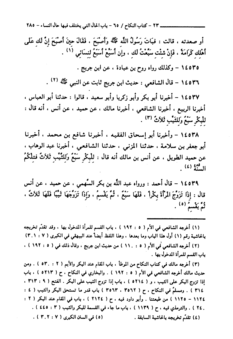 14538 - وَأَخْبَرَنَا أَبُو إِسْحَاقَ الْفَقِيهُ، أَخْبَرَنَا شَافِعُ بْنُ مُحَمَّدٍ، أَخْبَرَنَا أَبُو جَعْفَرِ بْنُ سَلَامَةَ، حَدَّثَنَا الْمُزَنِيُّ، حَدَّثَنَا الشَّافِعِيُّ، أَخْبَرَنَا عَبْدُ الْوَهَّابِ، عَنْ حُمَيْدٍ الطَّوِيلِ، عَنْ أَنَسِ بْنِ مَالِكٍ أَنَّهُ قَالَ: «§لِلْبِكْرِ سَبْعٌ وَلِلثَّيِّبِ ثَلَاثٌ»، فَتِلْكُمُ السُّنَّةُ