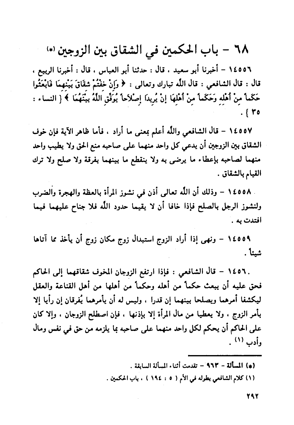 14556 - أَخْبَرَنَا أَبُو سَعِيدٍ قَالَ: حَدَّثَنَا أَبُو الْعَبَّاسِ قَالَ: أَخْبَرَنَا الرَّبِيعُ قَالَ: قَالَ الشَّافِعِيُّ: قَالَ اللَّهُ تَبَارَكَ وَتَعَالَى: {وَإِنْ خِفْتُمْ شِقَاقَ بَيْنِهِمَا فَابْعَثُوا حَكَمًا مِنْ أَهْلِهِ وَحَكَمًا مِنْ أَهْلِهَا إِنْ يُرِيدَا إِصْلَاحًا يُوَفِّقِ اللَّهُ بَيْنَهُمَا} [النساء: 35]