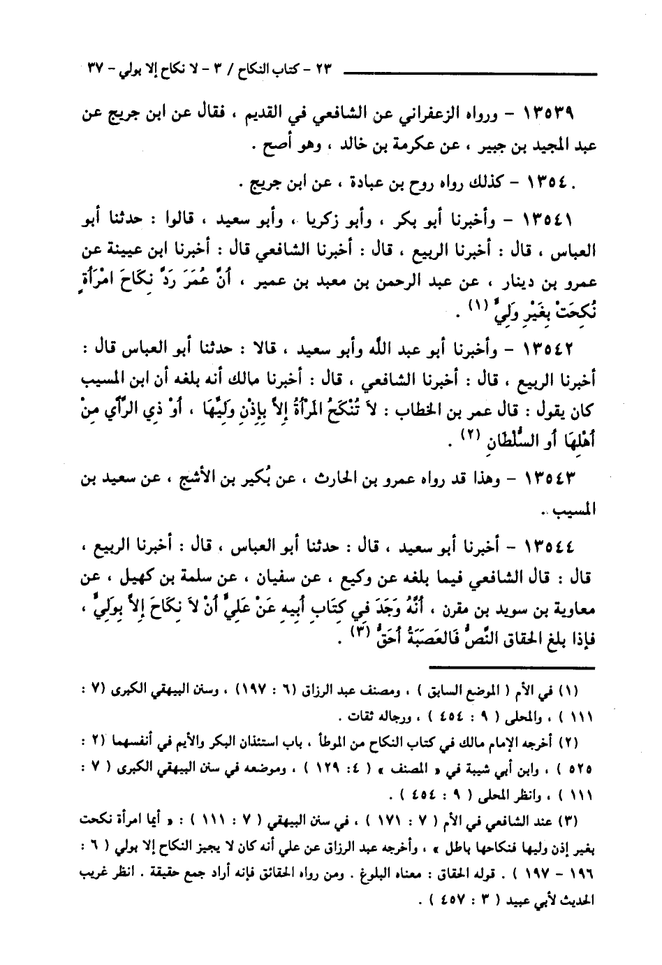 13541 - وَأَخْبَرَنَا أَبُو بَكْرٍ، وَأَبُو زَكَرِيَّا، وَأَبُو سَعِيدٍ قَالُوا: حَدَّثَنَا أَبُو الْعَبَّاسِ قَالَ: أَخْبَرَنَا الرَّبِيعُ قَالَ: أَخْبَرَنَا الشَّافِعِيُّ قَالَ: أَخْبَرَنَا ابْنُ عُيَيْنَةَ، عَنْ عَمْرِو بْنِ دِينَارٍ، عَنْ عَبْدِ الرَّحْمَنِ بْنِ مَعْبَدِ بْنِ عُمَيْرٍ، أَنَّ عُمَرَ § «رَدَّ نِكَاحَ امْرَأَةٍ نُكِحَتْ بِغَيْرِ وَلِيٍّ»
