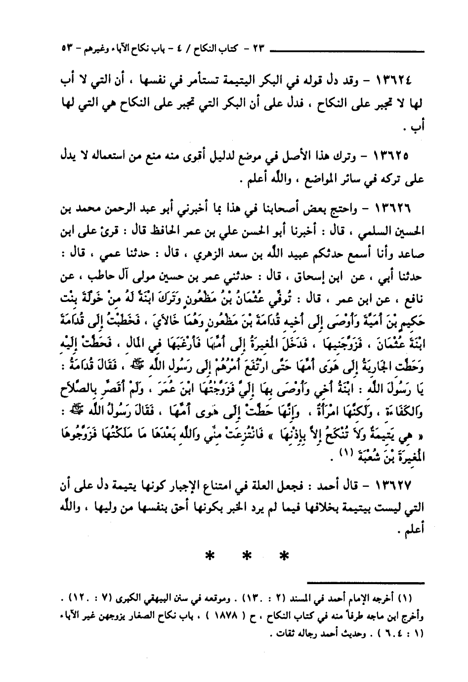 13626 - وَاحْتَجَّ بَعْضُ أَصْحَابِنَا فِي هَذَا بِمَا أَخْبَرَنِي أَبُو عَبْدِ الرَّحْمَنِ مُحَمَّدُ بْنُ الْحُسَيْنِ السُّلَمِيُّ قَالَ: أَخْبَرَنَا أَبُو الْحَسَنِ عَلِيُّ بْنُ عُمَرَ الْحَافِظُ قَالَ: قُرِئَ عَلَى ابْنِ صَاعِدٍ وَأَنَا أَسْمَعُ، حَدَّثَكُمْ عُبَيْدُ اللَّهِ بْنُ سَعْدٍ الزُّهْرِيُّ قَالَ: حَدَّثَنَا عَمِّي قَالَ: حَدَّثَنَا أَبِي، عَنِ ابْنِ إِسْحَاقَ قَالَ: حَدَّثَنِي عُمَرُ بْنُ حُسَيْنٍ مَوْلَى آلِ حَاطِبٍ، عَنْ نَافِعٍ، عَنِ ابْنِ عُمَرَ قَالَ: تُوُفِّيَ عُثْمَانُ بْنُ مَظْعُونٍ وَتَرَكَ ابْنَةً لَهُ مِنْ خَوْلَةَ بِنْتِ حَكِيمِ بْنِ أُمَيَّةَ، وَأَوْصَى إِلَى أَخِيهِ قُدَامَةَ بْنِ مَظْعُونٍ وَهُمَا خَالَايَ، فَخَطَبْتُ إِلَى قُدَامَةَ ابْنَةَ عُثْمَانَ، فَزَوَّجَنِيهَا، فَدَخَلَ الْمُغِيرَةُ إِلَى أُمِّهَا فَأَرْغَبَهَا فِي الْمَالِ، فَحَطَّتِ إِلَيْهِ وَحَطَّتِ الْجَارِيَةُ إِلَى هَوَى أُمِّهَا حَتَّى ارْتَفَعَ أَمْرُهُمْ إِلَى رَسُولِ اللَّهِ صَلَّى اللهُ عَلَيْهِ وَسَلَّمَ، فَقَالَ قُدَامَةُ: يَا رَسُولَ اللَّهِ، ابْنَةُ أَخِي وَأَوْصَى بِهَا إِلَيَّ فَزَوَّجْتُهَا ابْنَ عُمَرَ، وَلَمْ أُقَصِّرْ بِالصَّلَاحِ وَالْكَفَاءَةِ، وَلَكِنَّهَا امْرَأَةٌ، وَإِنَّهَا حَطَّتِ الَى هَوَى أُمِّهَا، فَقَالَ رَسُولُ اللَّهِ صَلَّى اللهُ عَلَيْهِ وَسَلَّمَ: «§هِيَ يَتِيمَةٌ وَلَا تُنْكَحُ إِلَّا بِإِذْنِهَا»، فَانْتُزِعَتْ مِنِّي وَاللَّهِ بَعْدَهَا مَا مَلَكْتُهَا فَزَوَّجُوهَا الْمُغِيرَةَ بْنَ شُعْبَةَ